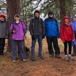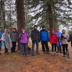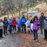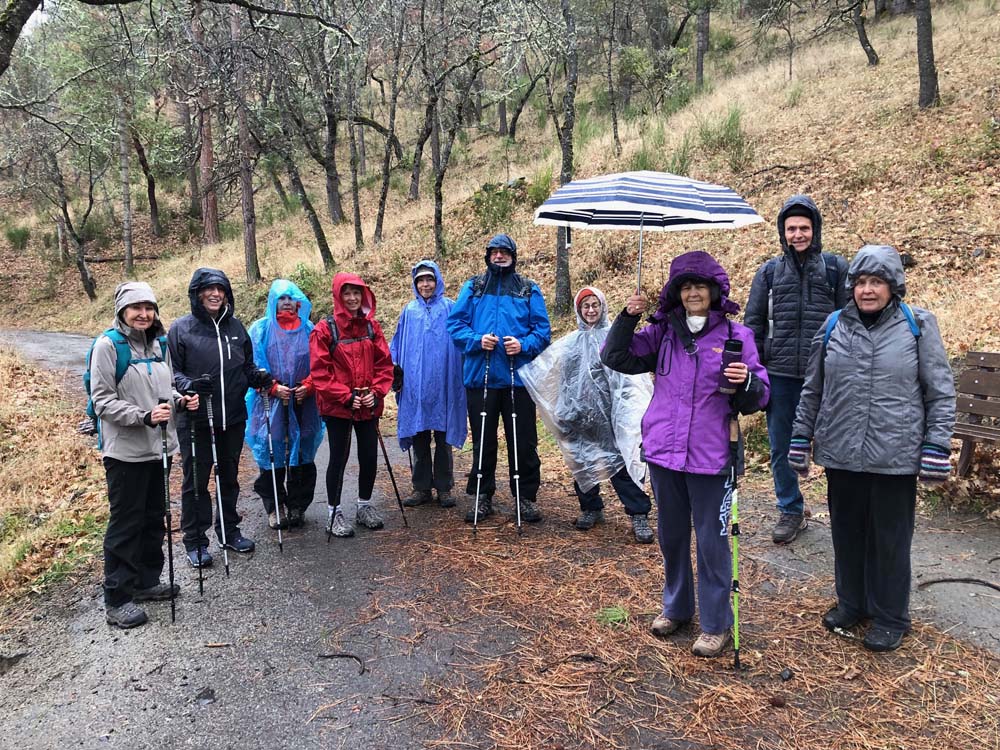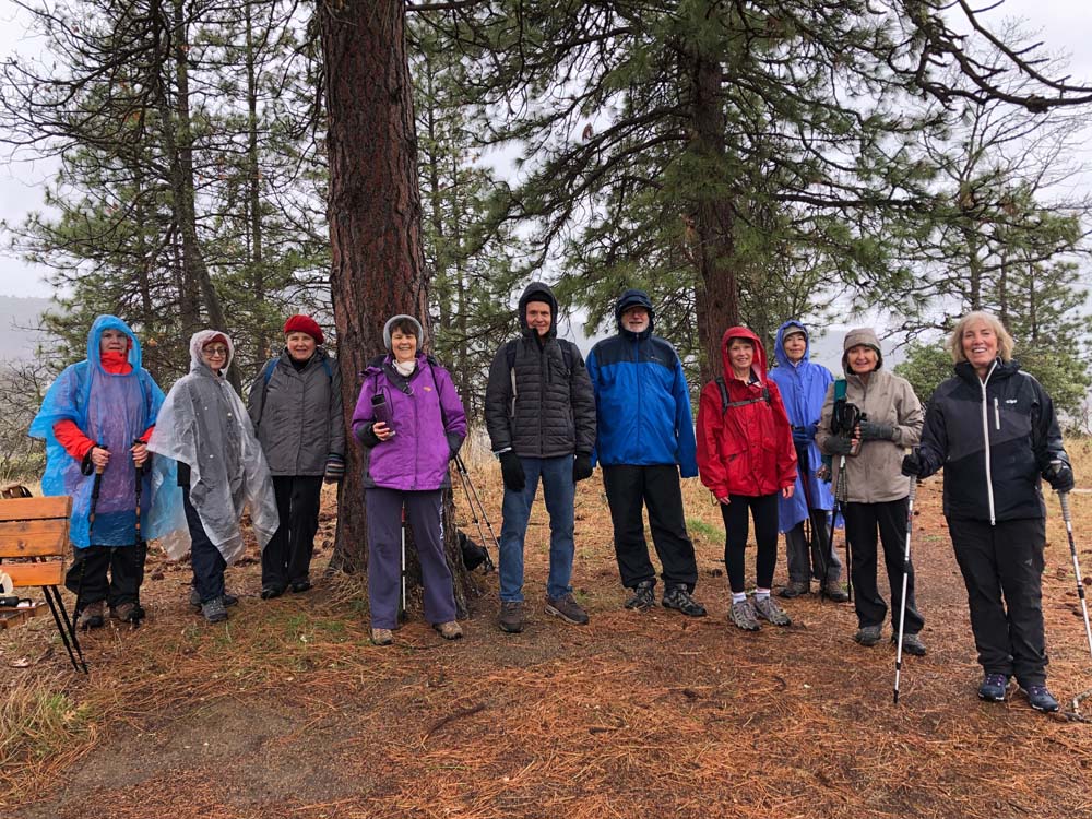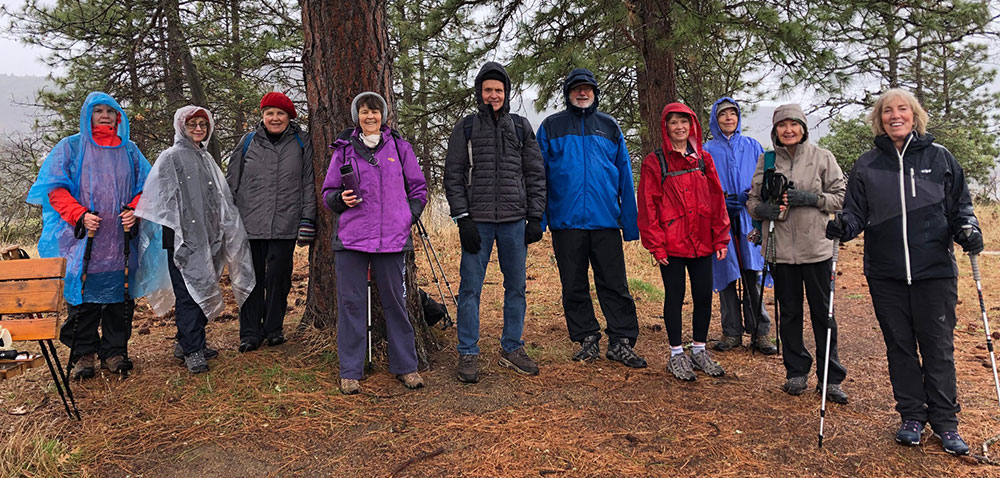 Avoiding wet snow for snowshoeing and muddy trails at Emigrant Lake, eleven of us climbed up steps on Logan Street into Hald-Strawberry Park trails and the TID trail. It was raining throughout, but lightly and without much wind.