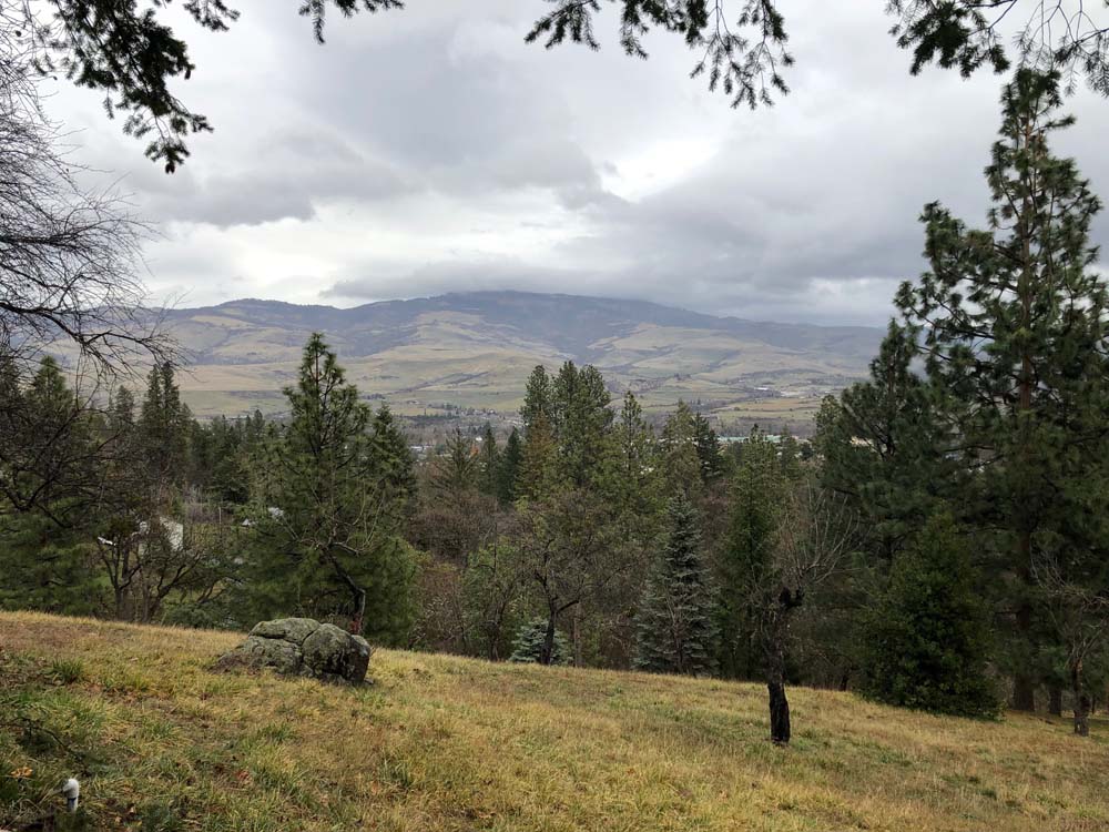 The moisture gave the Madrone trees their brilliant red color. Wandering about on the hillside offers nice views of the town on one side and homes on the far side slopes. Even the somewhat unremarkable trail, our hikers enjoy their conversations as they walk between lovely evergreens and the ditch.
