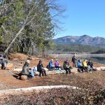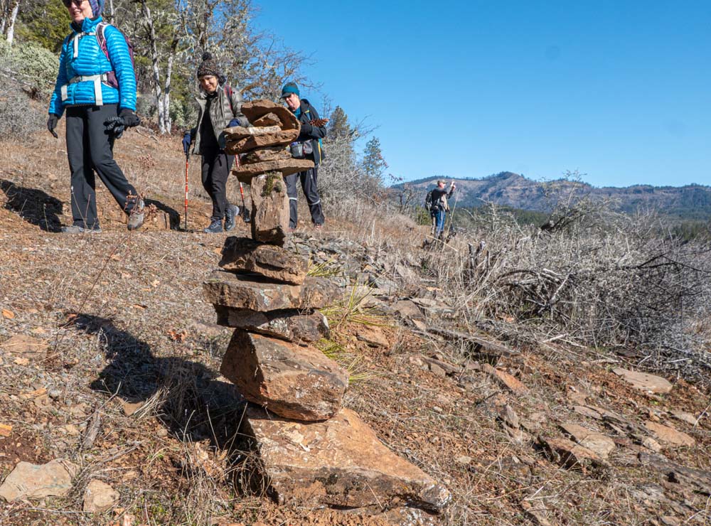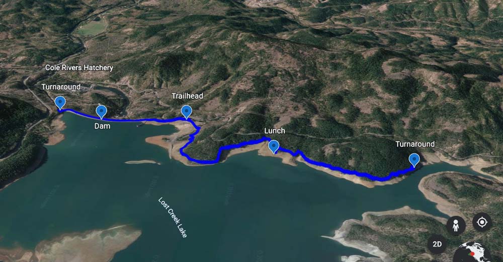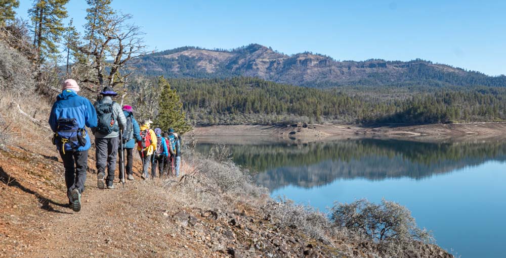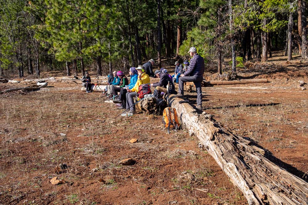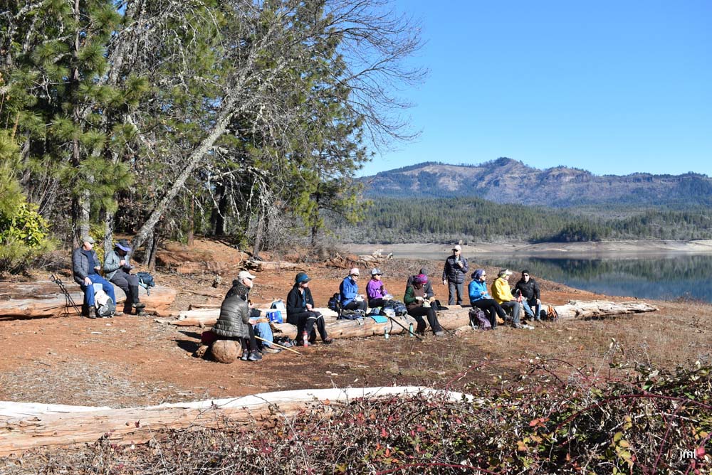 Our caravan of 4 SUVs pulled into the parking lot for the Takelma Day use area. The plan was to hike out on the Rogue Trail for an hour before returning to the TH. Although it felt good in the sun most of the trail was in the shade and chilly. On the way back we noticed a campground with plenty of sun by the lake shore and lots of big logs to sit on, so we decided to make this our lunch spot.