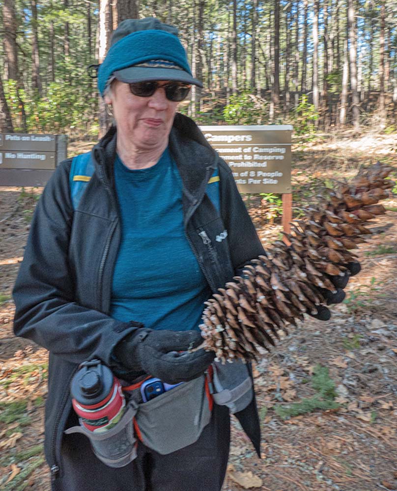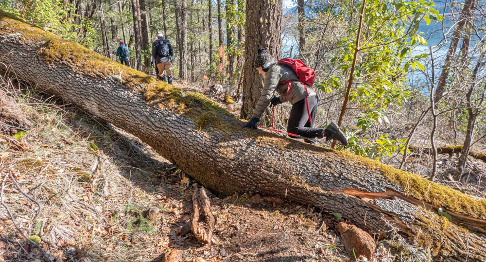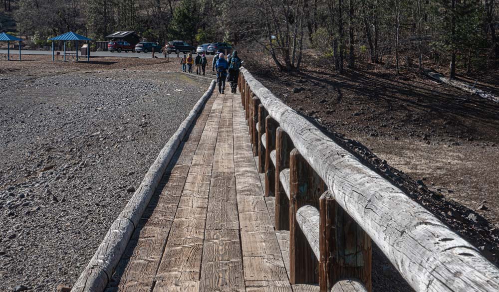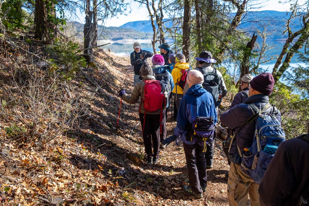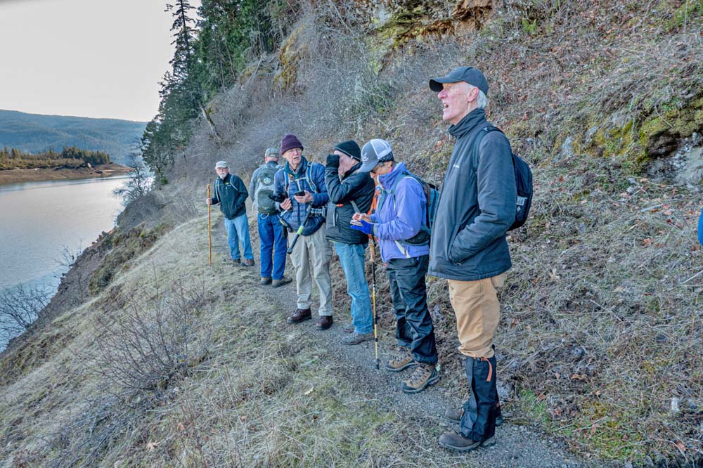 Our caravan of 4 SUVs pulled into the parking lot for the Takelma Day use area. The plan was to hike out on the Rogue Trail for an hour before returning to the TH. Although it felt good in the sun most of the trail was in the shade and chilly. On the way back we noticed a campground with plenty of sun by the lake shore and lots of big logs to sit on, so we decided to make this our lunch spot.