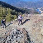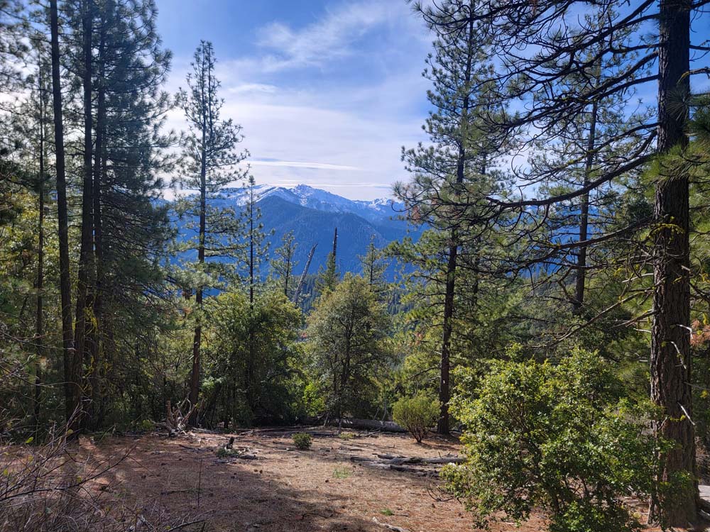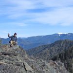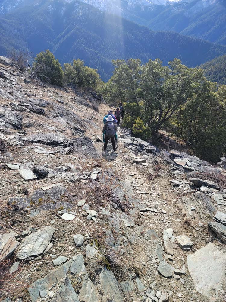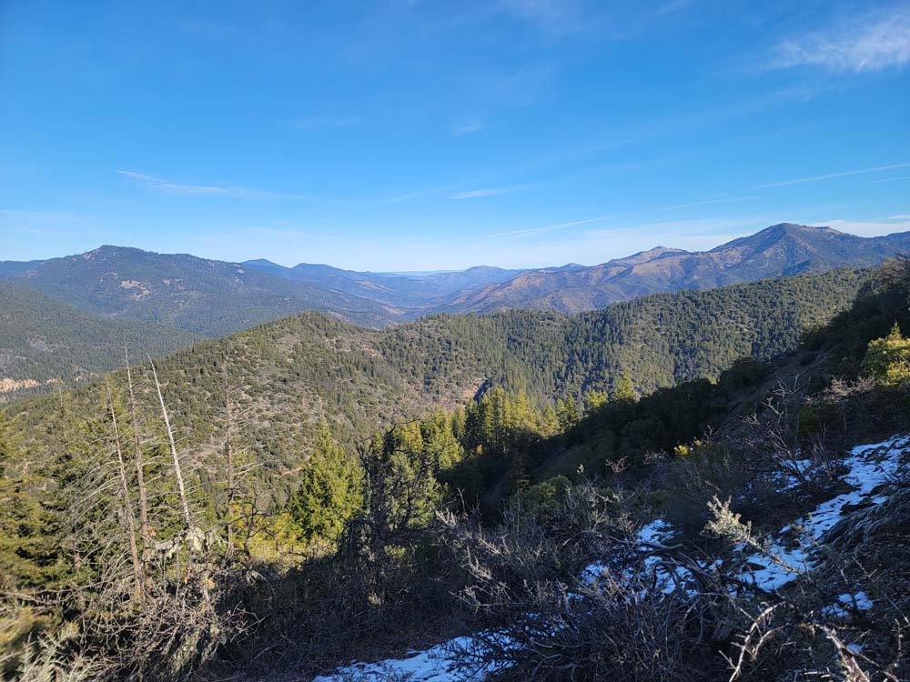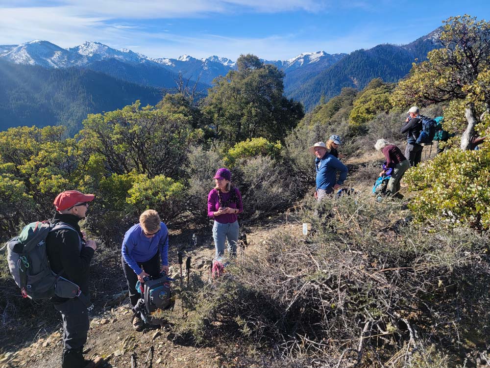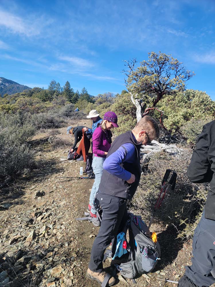 We continued up the trail through a mixed conifer forest. Before reaching the saddle, we encountered a little bit of snow. It was the first time for Erin and for Jay to be on this hike and they enjoyed the views of all the snow covered mountains. We took our packs off for a small snack break.