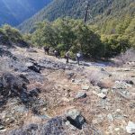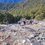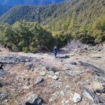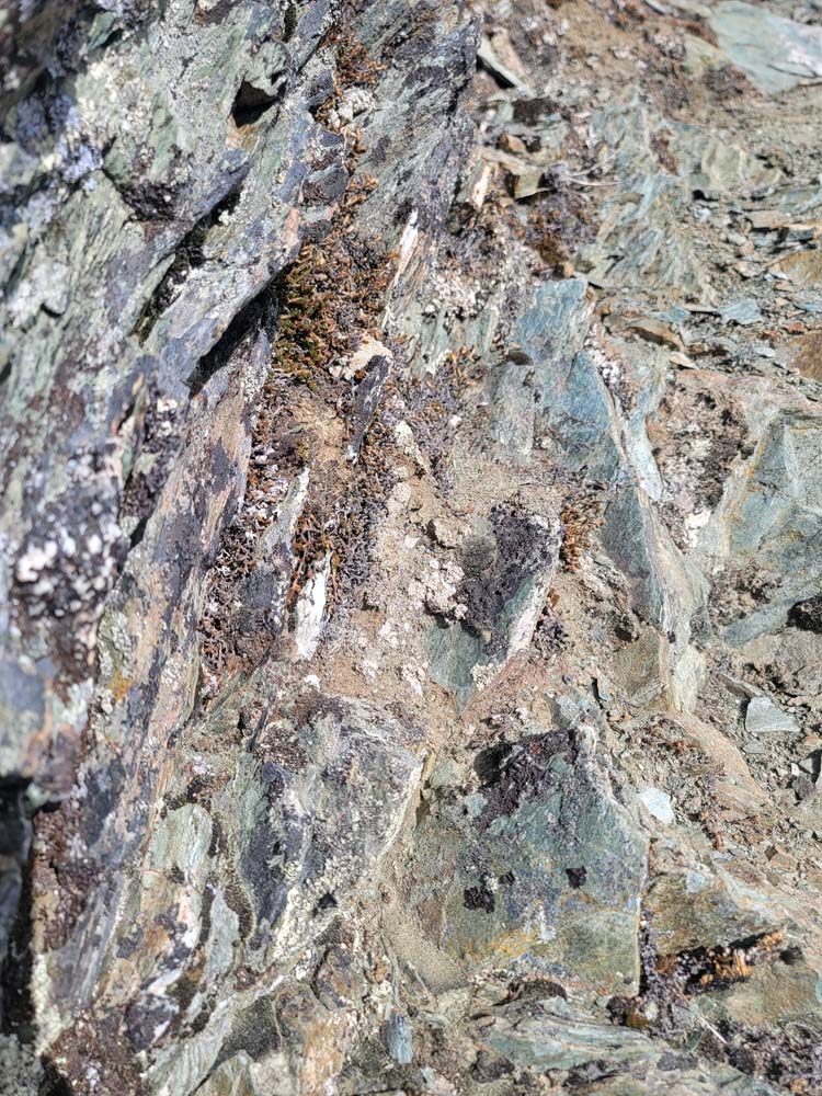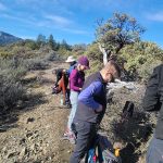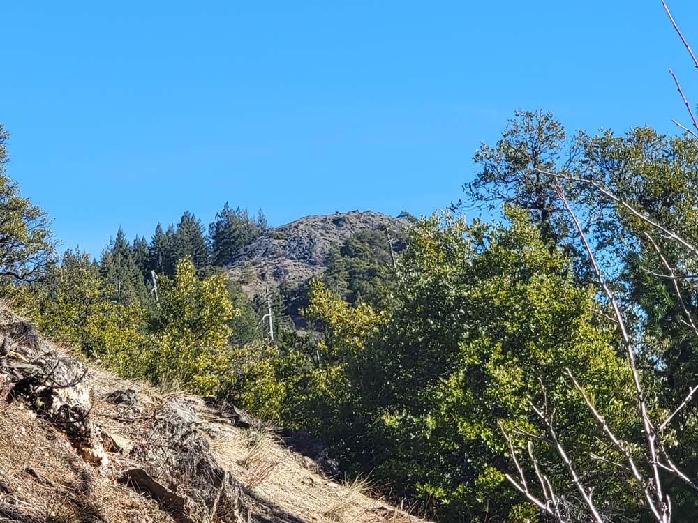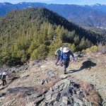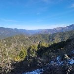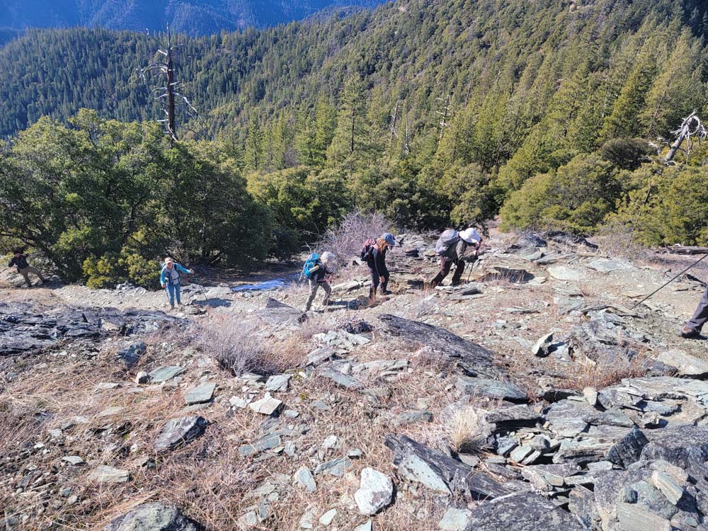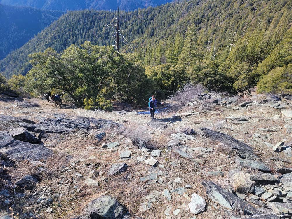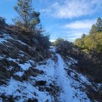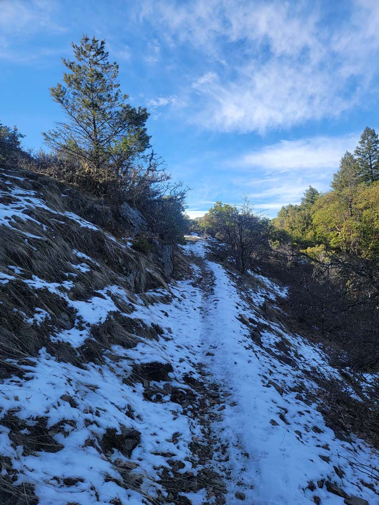 We continued up the trail through a mixed conifer forest. Before reaching the saddle, we encountered a little bit of snow. It was the first time for Erin and for Jay to be on this hike and they enjoyed the views of all the snow covered mountains. We took our packs off for a small snack break.