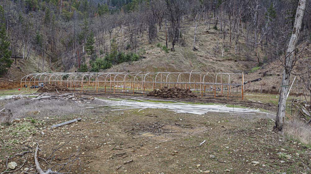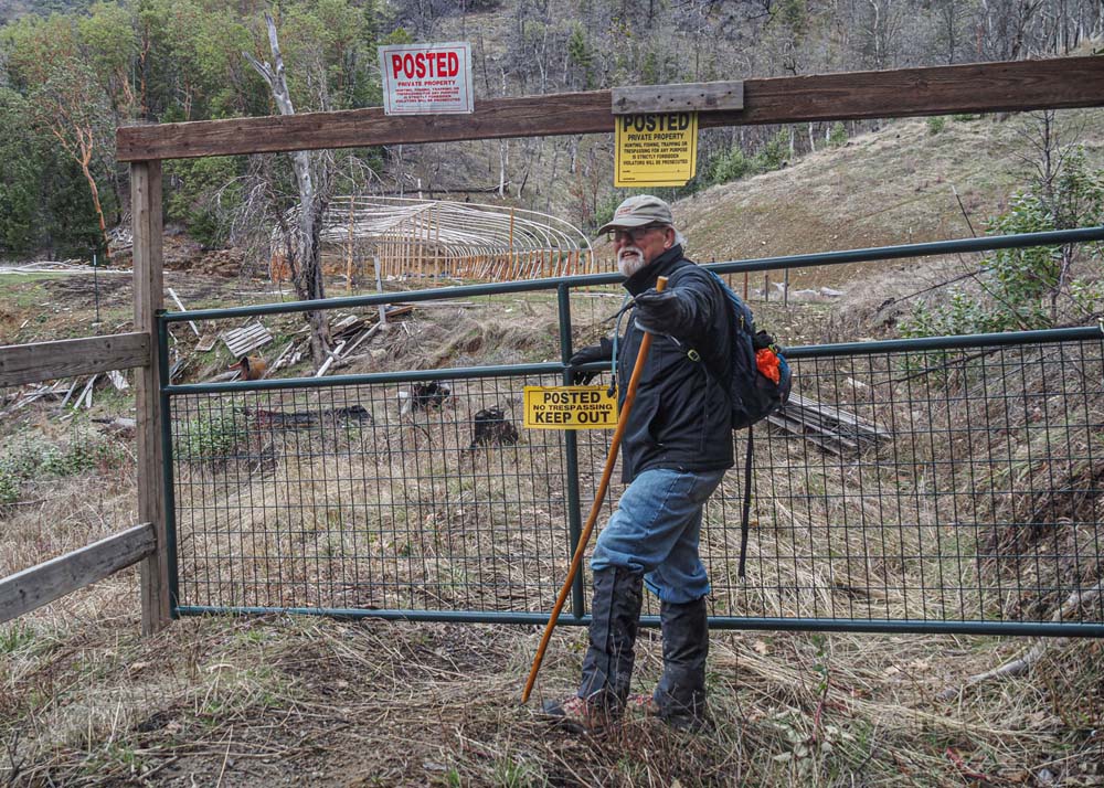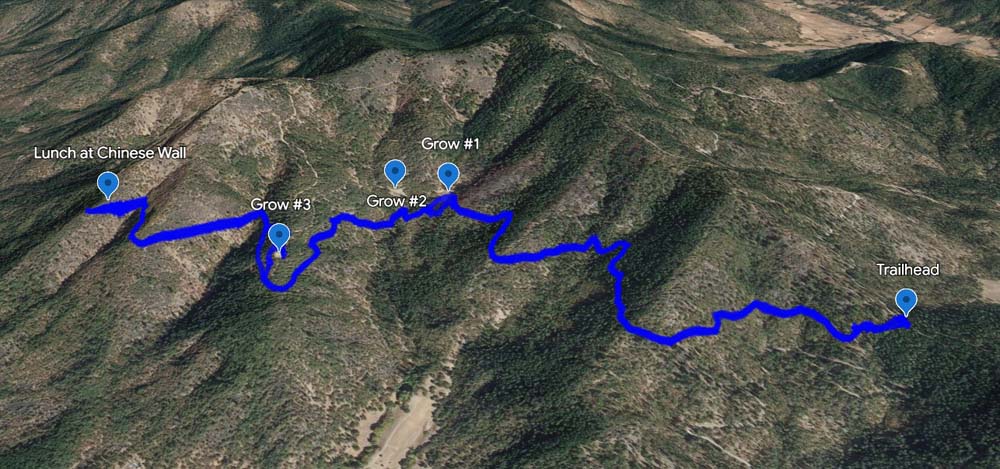 The trail is mostly level as it parallels the ditch; but there is a necessary bypass to avoid some man made eye sores on the trail. Perhaps similar to the 19th century prospectors who hoped to strike it rich, beginning in 2015 three separate Marijuana grows were built right on the trail! Now seemingly abandoned and in disrepair with skeletal remains of green houses, a locked gate has been erected and hikers must use the long bypass to get around the failed dope grows and back onto the Layton trail.