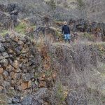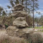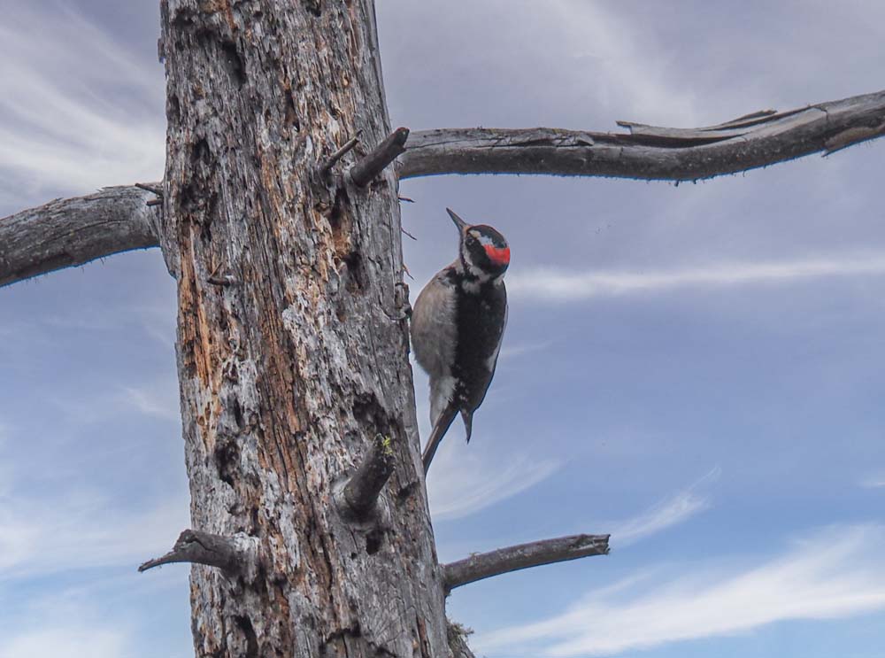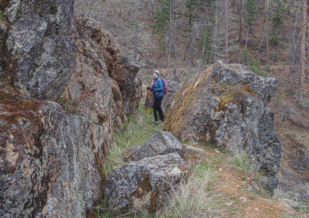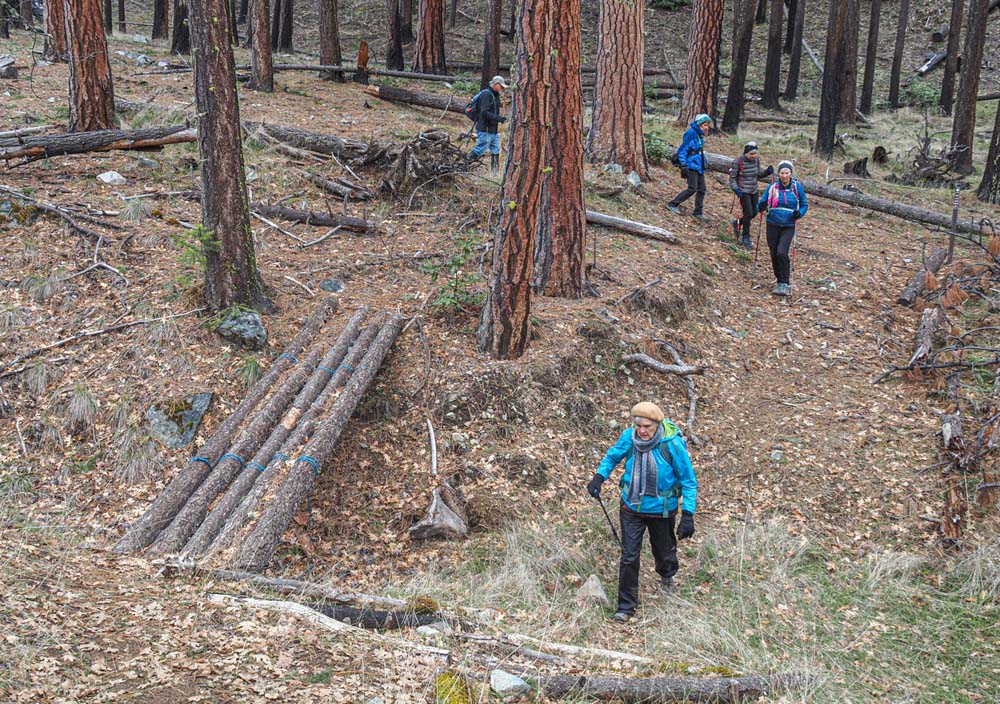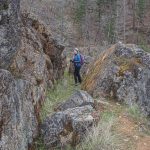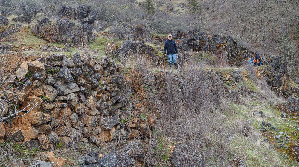 Fairly soon our lunch spot came into view, the historic Chinese wall, who’s construction allowed the ditch water to complete its journey to Layton Mine in Ferris Gulch. Briefly, a huge rock outcropping stood in the way of the ditch, Chinese laborers used lots of dynamite to blast a rock ditch in the outcropping; then with the rock fragments built a retaining wall to allow the water to continue flowing to the mine on the other side of the ridge.