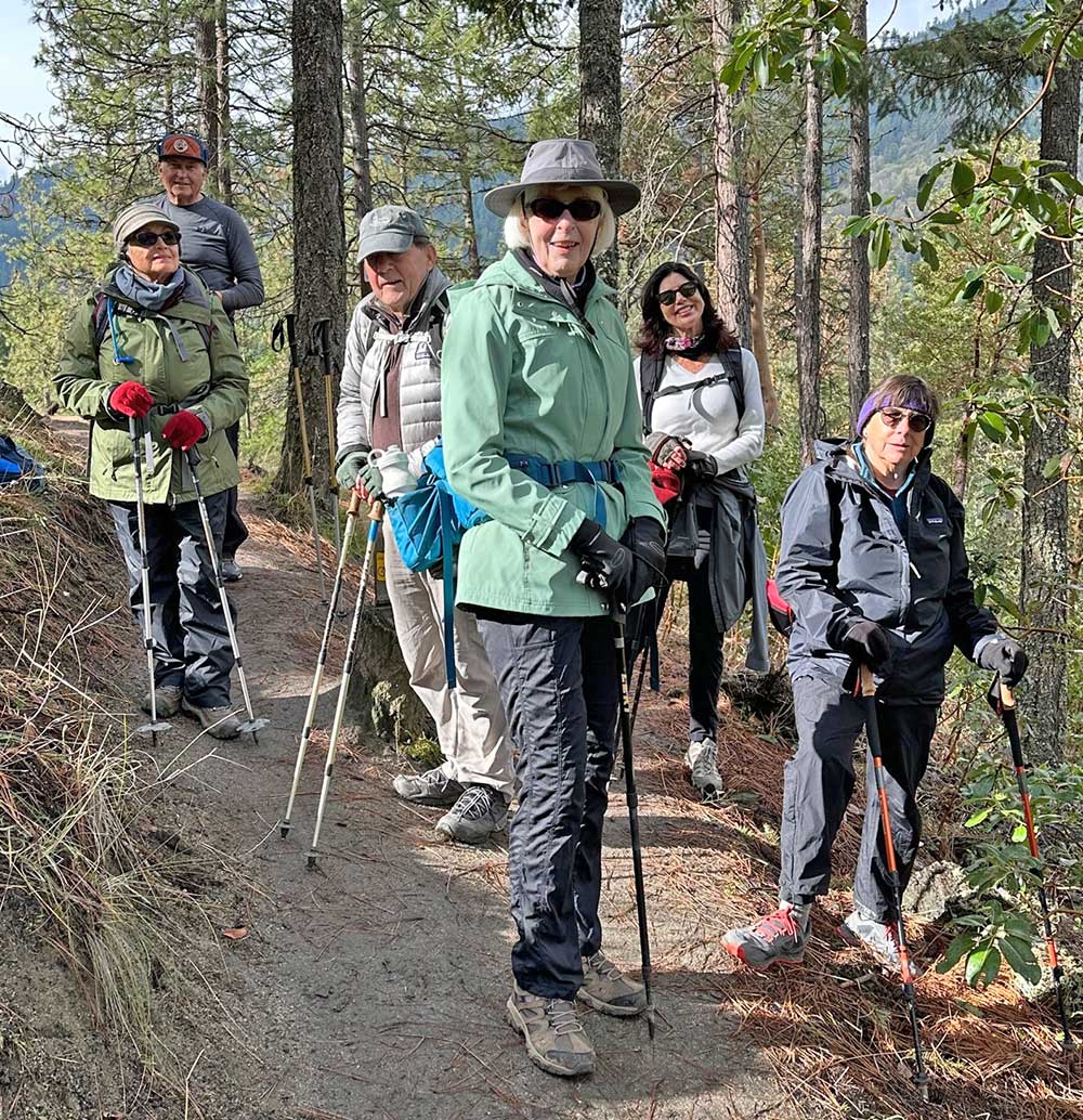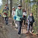 Those of us willing to challenge the weather forecast to enjoy the magnificence of the forest, arrived in great spirits with abundant energy. The hike leader choosing to lead by example showed up in full rain regalia, prepared to weather the worst. Much to our delight, the foul weather did not manifest and layers started coming off early as blue skies with fluffy white clouds appeared.
