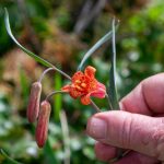 The last switch back takes you into the forest and deposits you on top of the ridge. Always an inspiring sight with snow capped peaks in the distance and the Little Applegate valley below. On this Monday we were immediately greeted by red blooming Grass Widows and later on the ridge trail by Scarlet Fritillary.