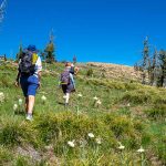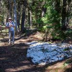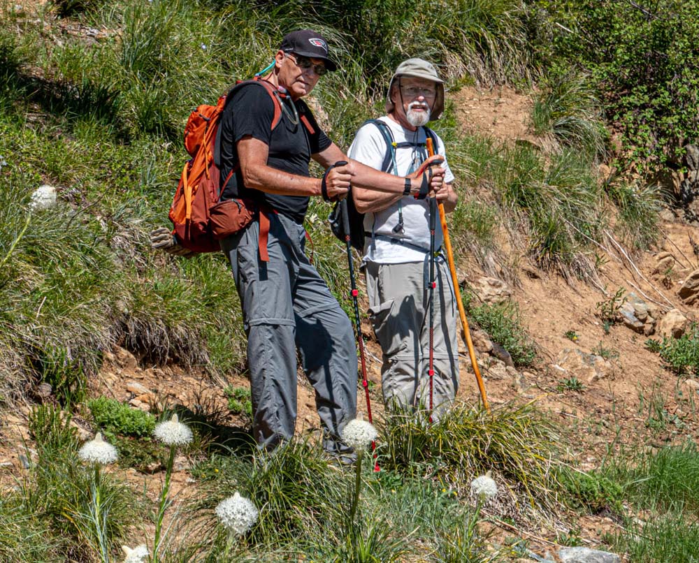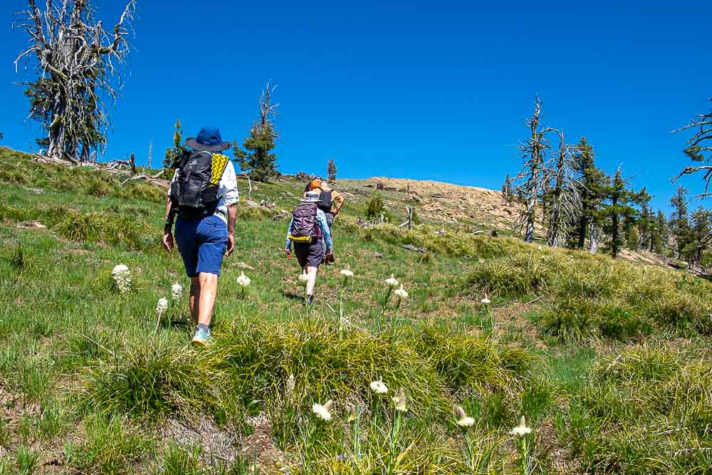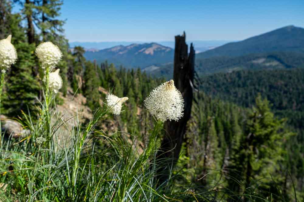 Along the trail, we saw color provided by wildflowers including the first blooms of white Bear Grass, periwinkle Phlax, white Anemone, yellow Sulphur Buckwheat, pink Lewishia, and orange Scarlet Gilia.
