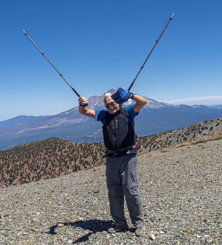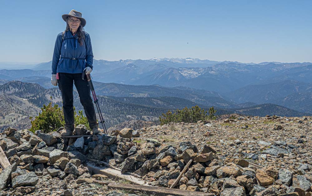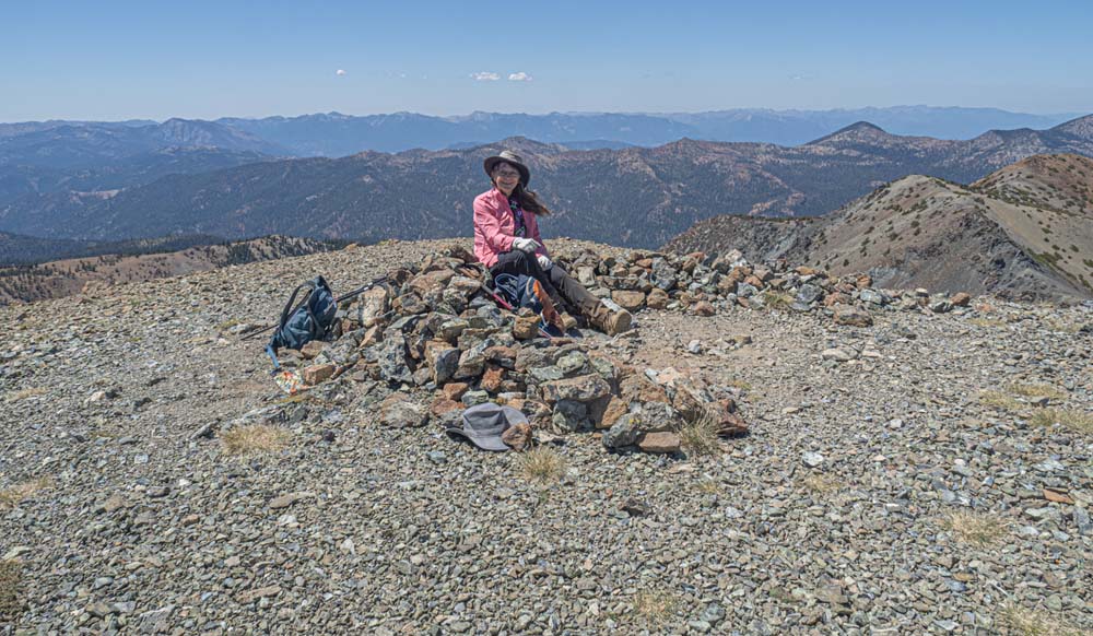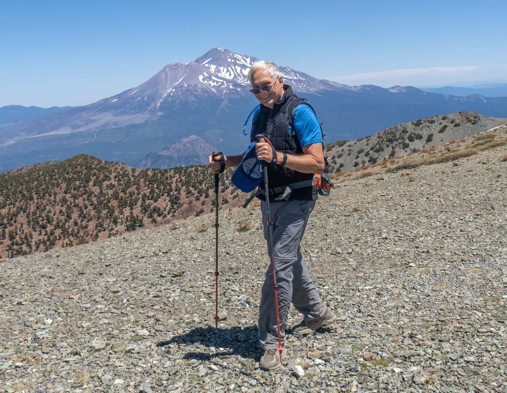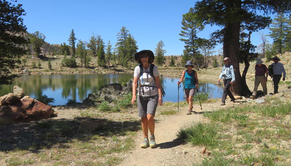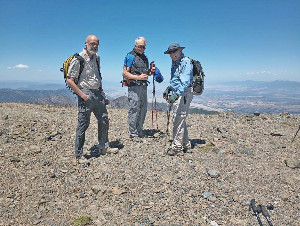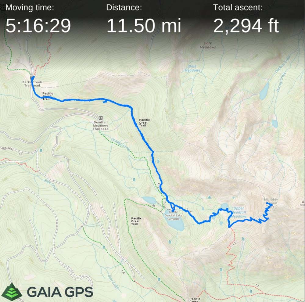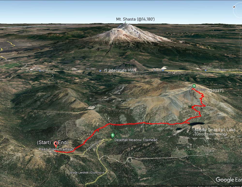 Besides those six pictured, congratulations also to Tony and Mike! They had great views of Mt Shasta and surrounding peaks! On this day, the hike to Upper Deadfall Lake was 9.3 miles RT and 1,200′ of gain; and the hike to Mt Eddy summit was 10.4 miles and 2,400′ of gain.