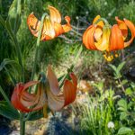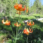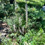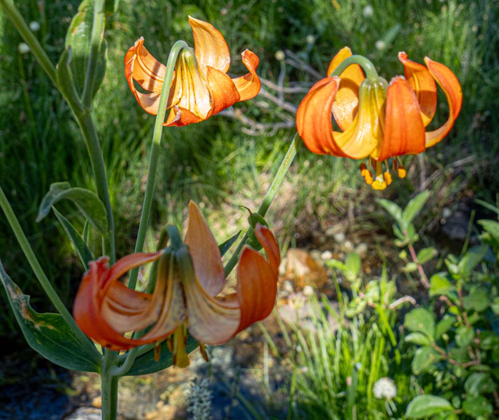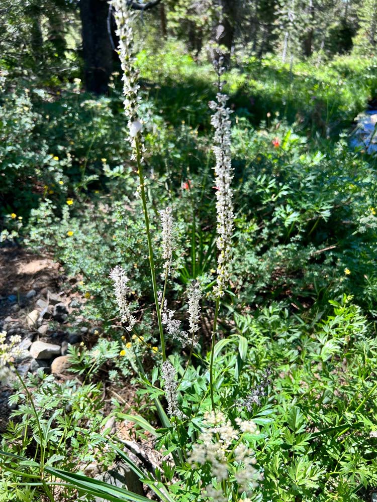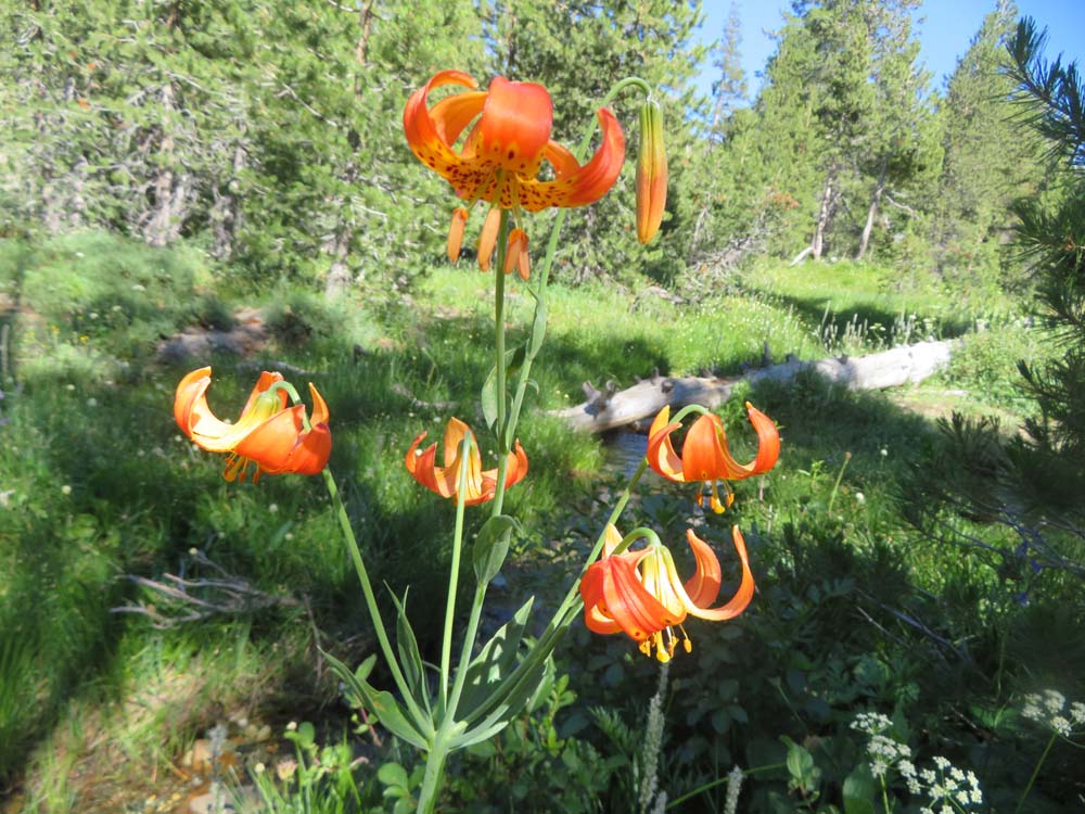 The color from wildflowers along the trail and around Upper Deadfall Lake (7800′) was exceptional; including the unique yellow Mt Eddy Lupine, endemic to the area of today’s hike. Also special were the orange Leopard Lily, white Bog Orchids and Cobra Lilies (Darlintonia) seen near the road heading up and in the vast meadow between Lower and Middle Deadfall Lakes.