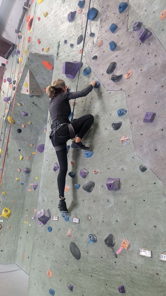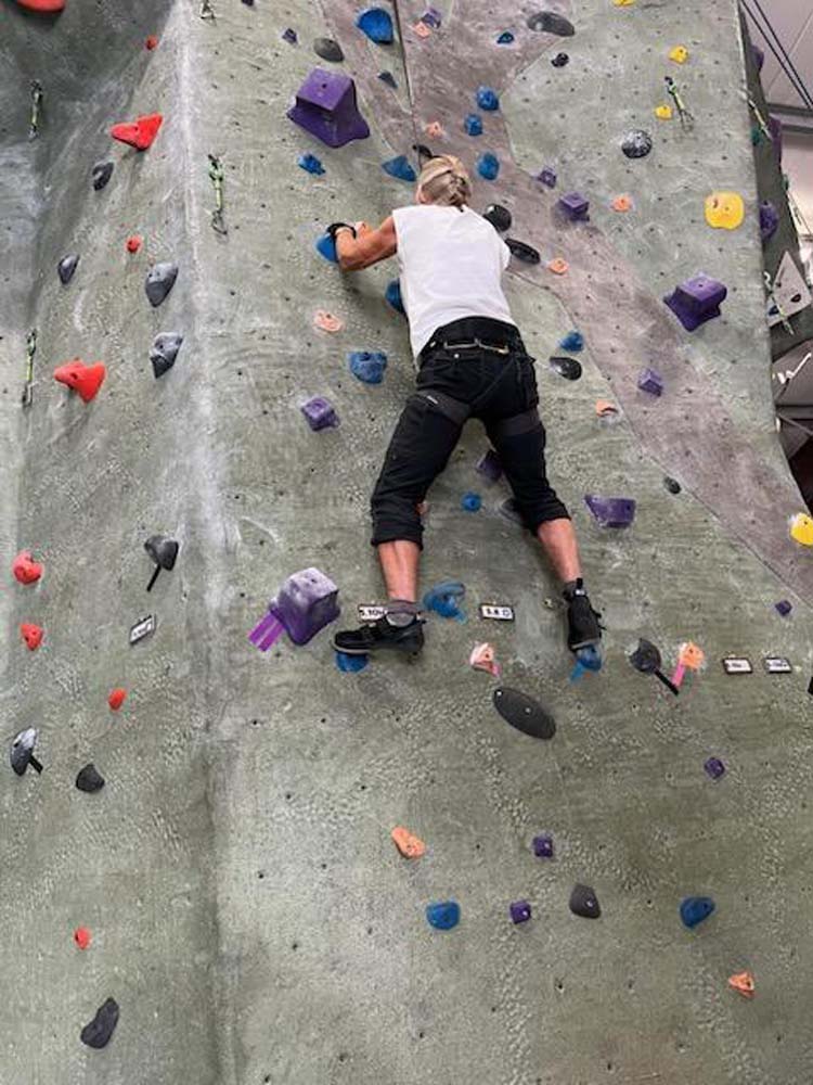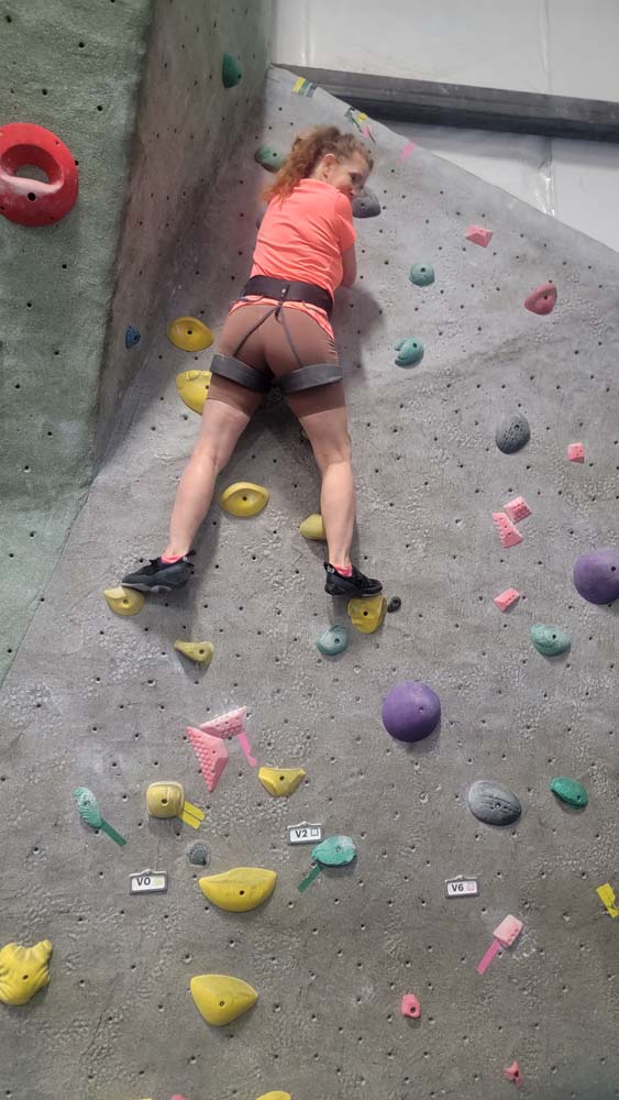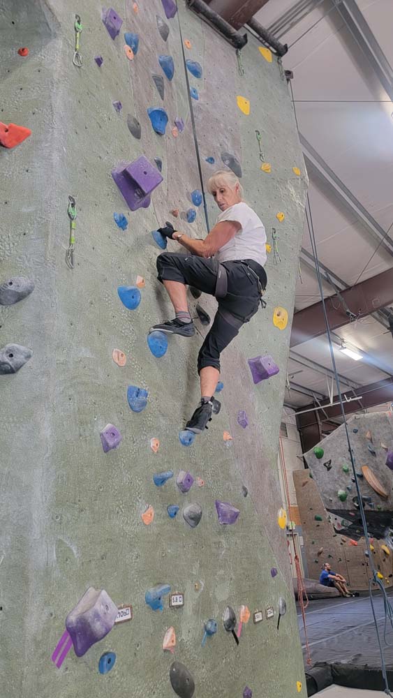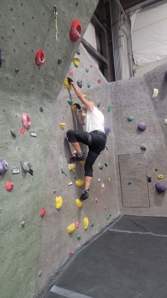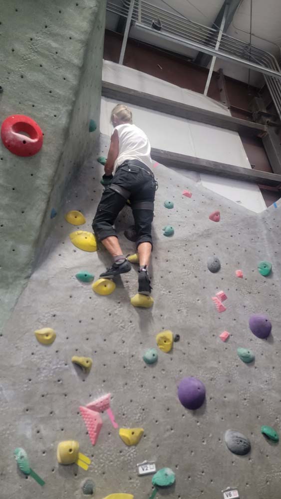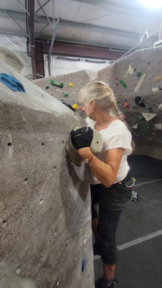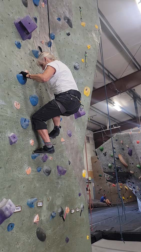 On August 23rd Leslie, Sherry and I decided to not let the smoke stop us from getting out and getting in some exercise. We met at 9:15am at the Rogue Rock Gym in Phoenix, OR. The cost was $20 for use of their facilities for the entire day. They have a gym with weights, treadmills, rowers, bikes, a punching bag and various machines for weight lifting exercises. But the reason we went was to climb the rock walls. Since this was our first time to visit, they did not charge us to rent the harnesses or climbing shoes. Normal prices: Shoes: $4 Harness: $2 Chalk: $2 Belay Device: $2 Rental Package: $6.