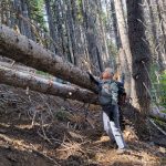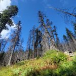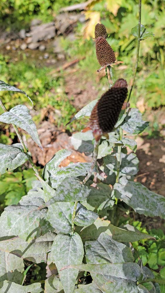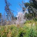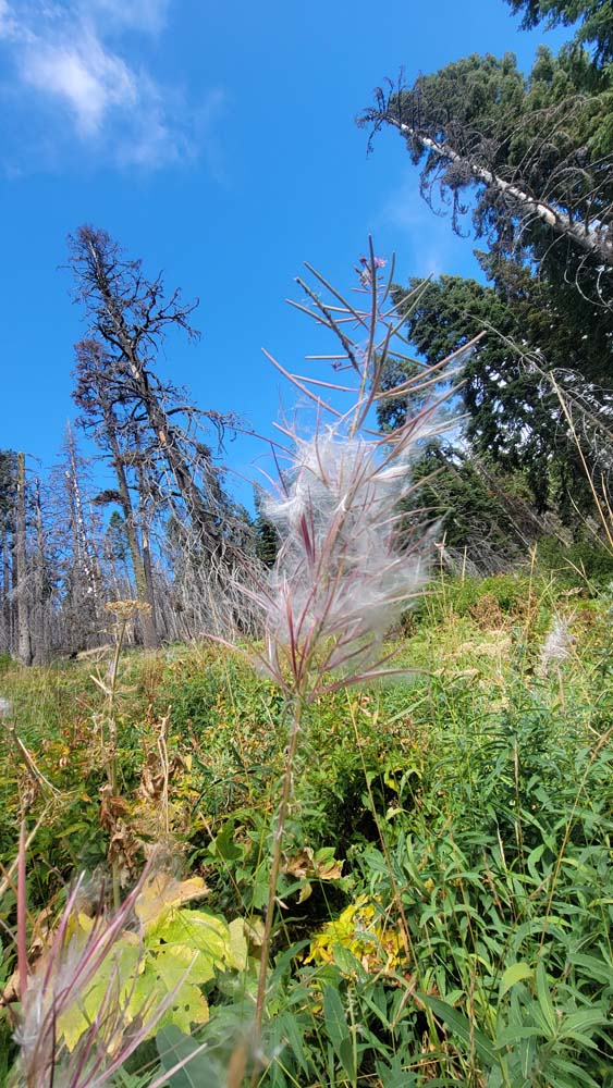 As we went up higher, we went through the burn area. On doing research, this is what I found: “The Creedence Fire began with a strike of lightning on August 14, 2017 and burned in the back-country surrounding Grayback Mountain and the Kangaroo Roadless Area. Two fires were ignited, one on the lower slope of Bigelow Creek, and another high on the ridge near O’Brien Creek Meadows in the Grayback Mountain Botanical Area, at the headwaters of Carberry Creek. The two fires later merged to become the Creedence Fire, the westernmost fire in the Miller Complex… burning 2,093 acres.’ [1] We could see fireweed with thin pods that split, releasing silky white fluff with tiny seeds attached.