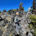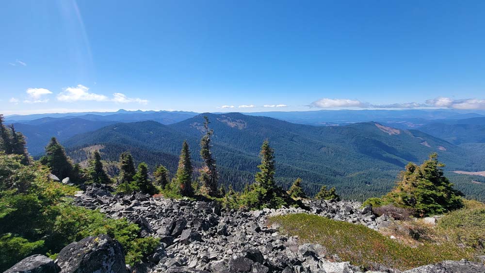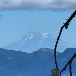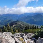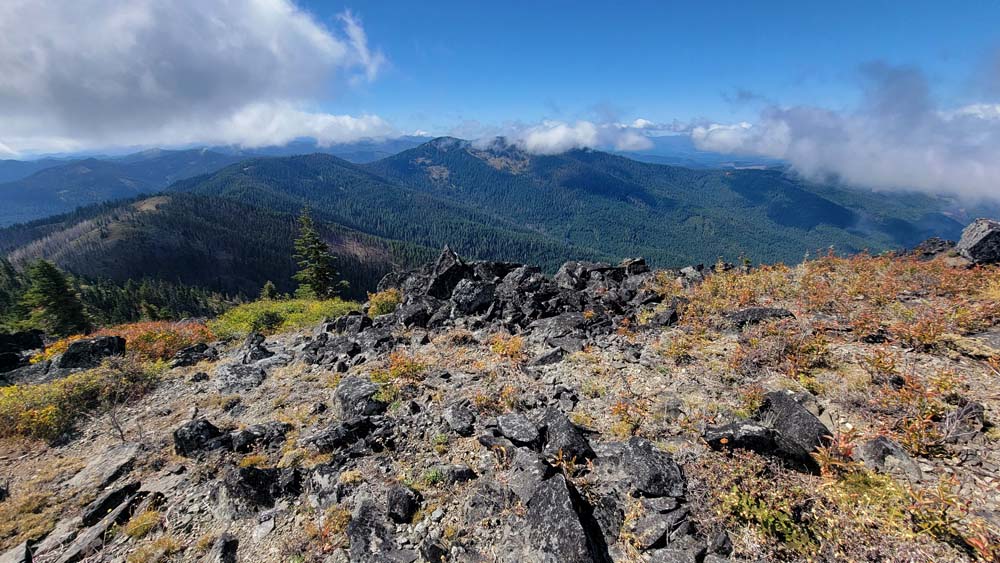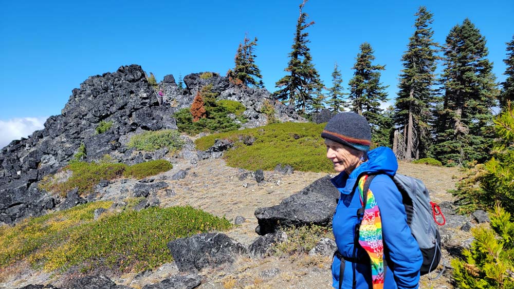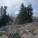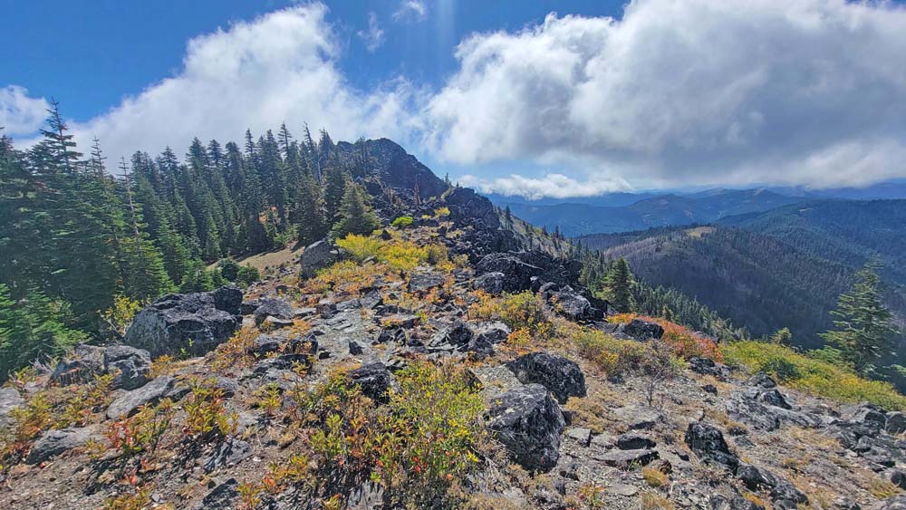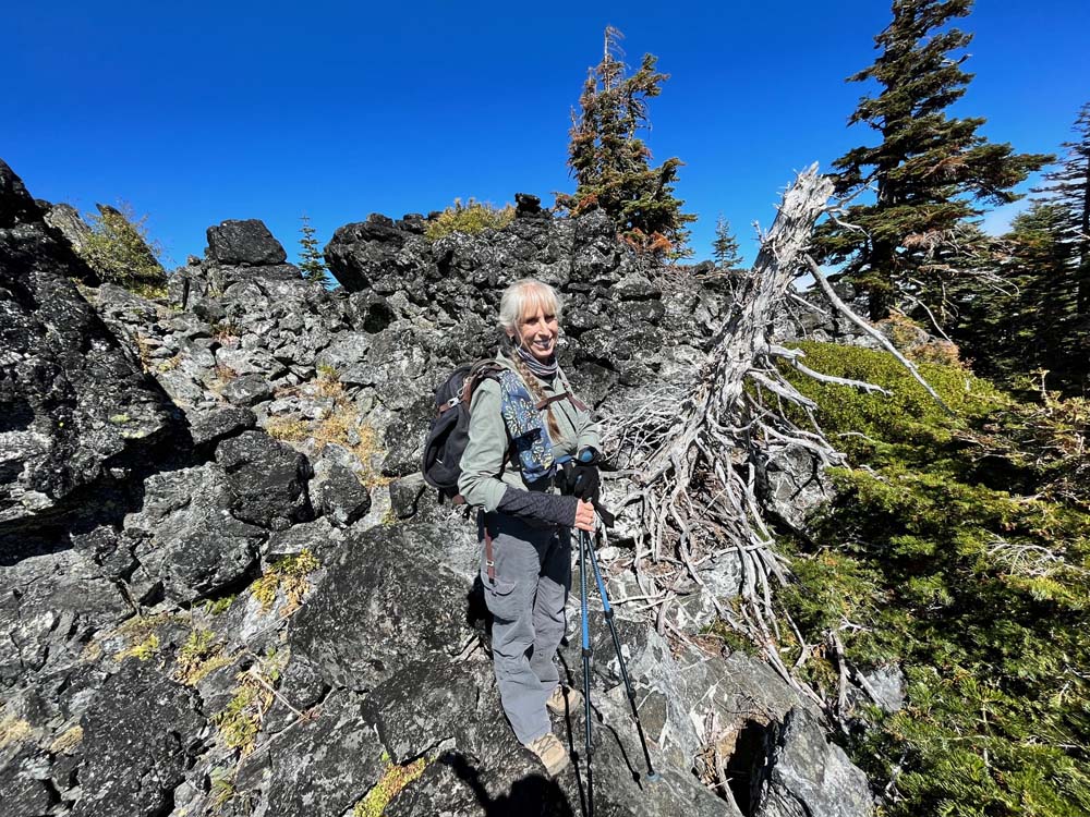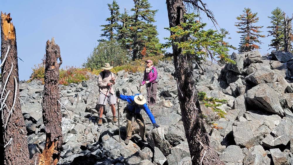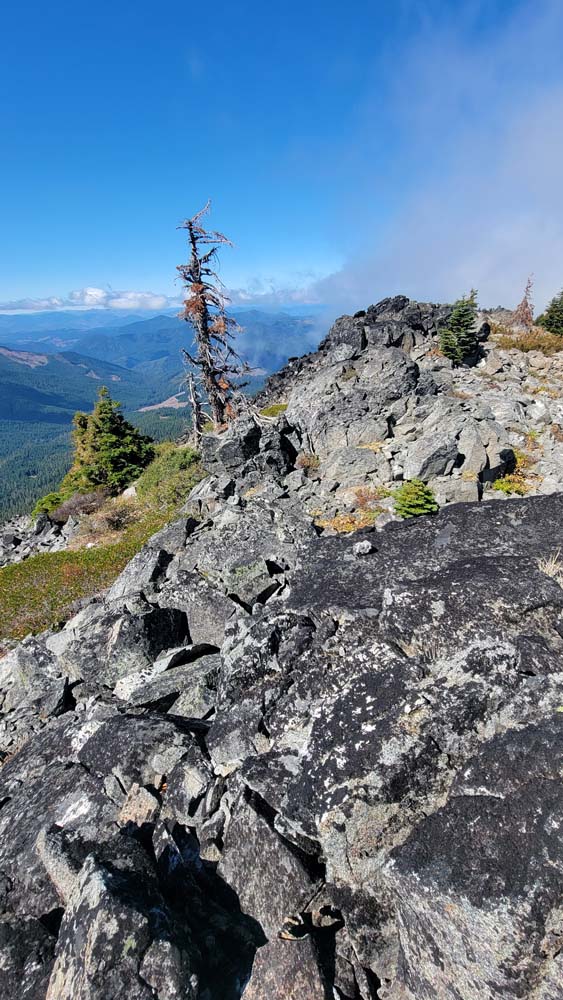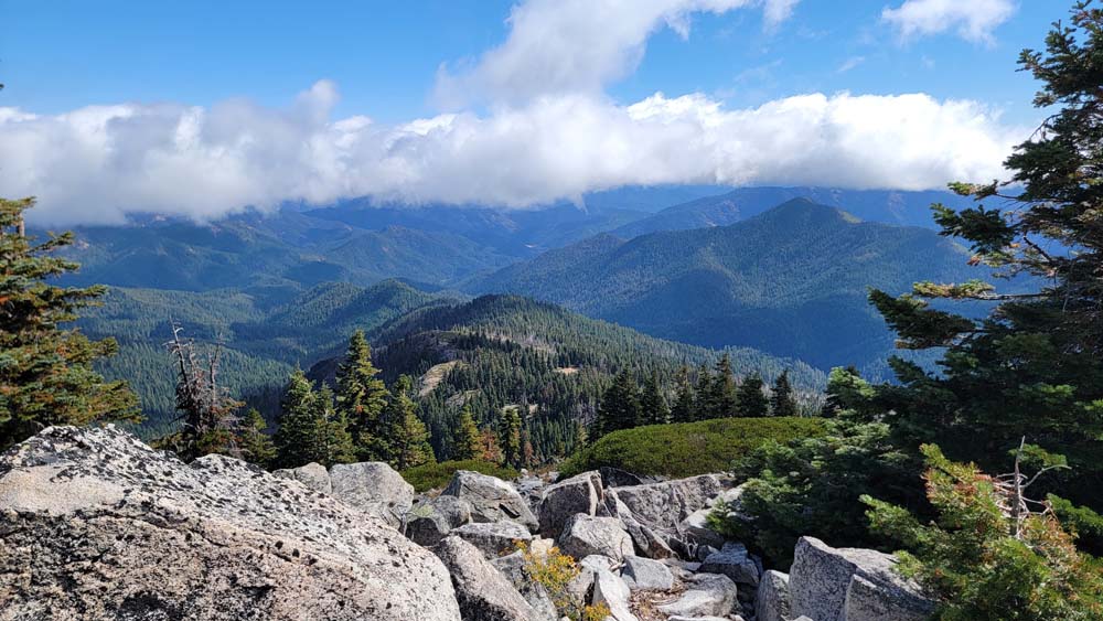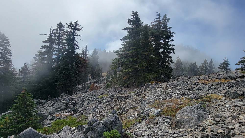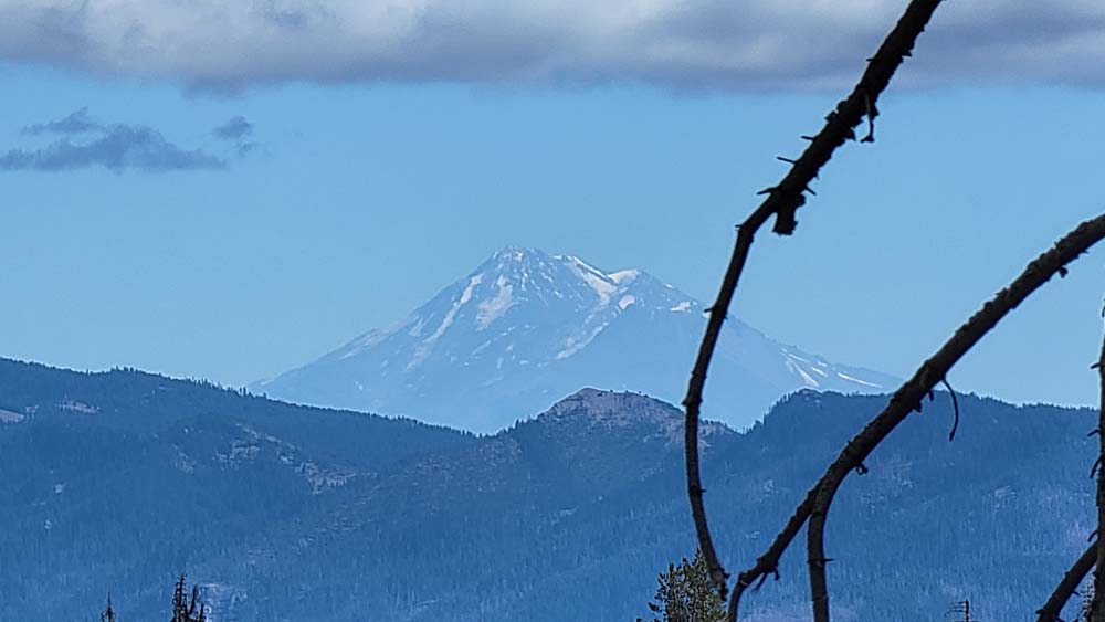 We decided to go down through the trees and rocks instead of staying on the ridge. Barb decided to mix the terms bushwhacking and climbing through rocks and say we were rockwhacking. The term seemed fitting. I believe this method cut off much of our time going downhill. As we continued down the trail, we could see Mount Shasta and the bottom of Mount McLoughlin because the top was covered with clouds.