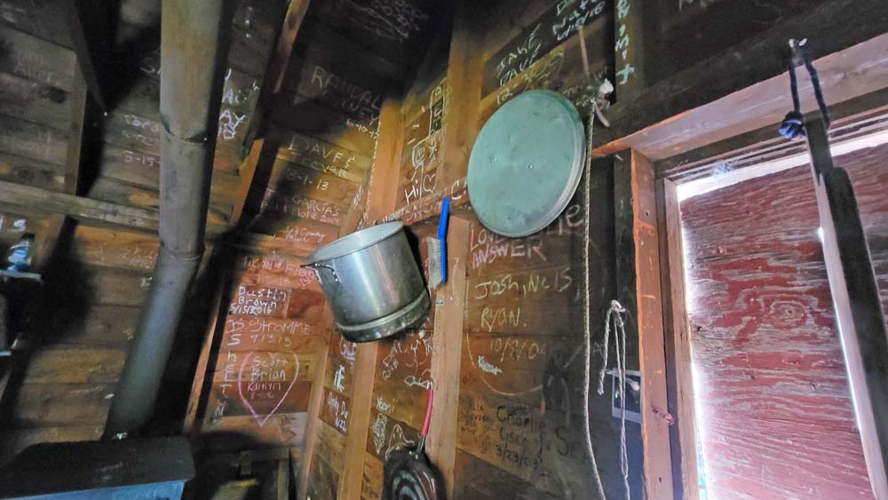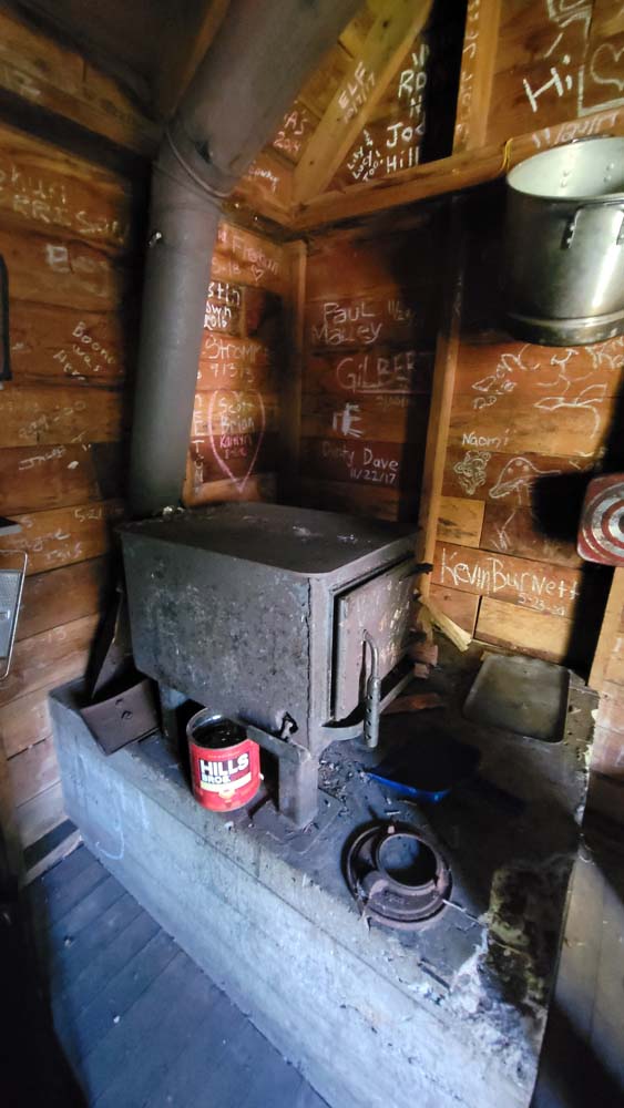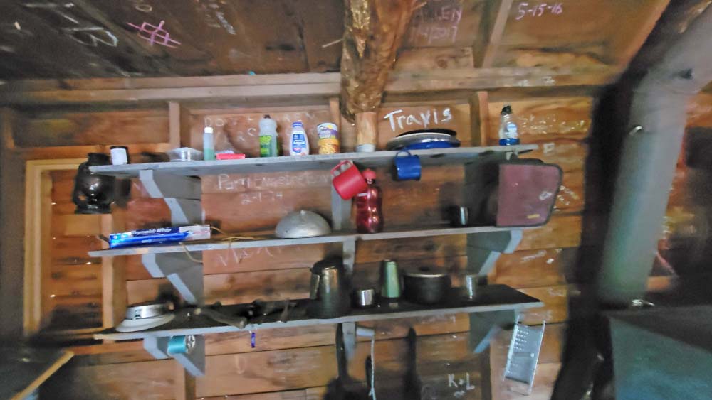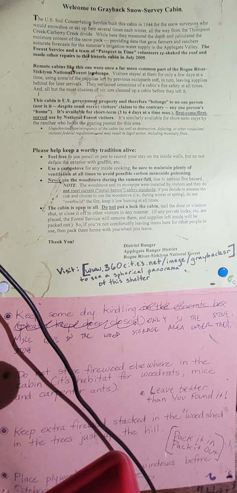 When we were most of the way down the trail, we took a side trip to the O’Brien Cabin. The U.S. Soil Conservation Service built this cabin in 1944 for the snow surveyors who would snowshoe or ski up here several times each winter, all the way from the Thompson Creek/Carberry Creek divide. While here they measured the depth and calculated the moisture content of the snow pack providing data that gave farmers and ranchers accurate forecasts for the summer’s irrigation supply in the Applegate Valley.