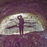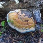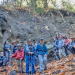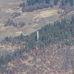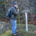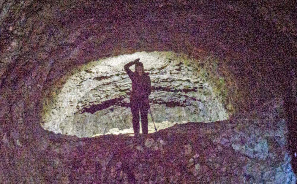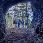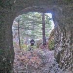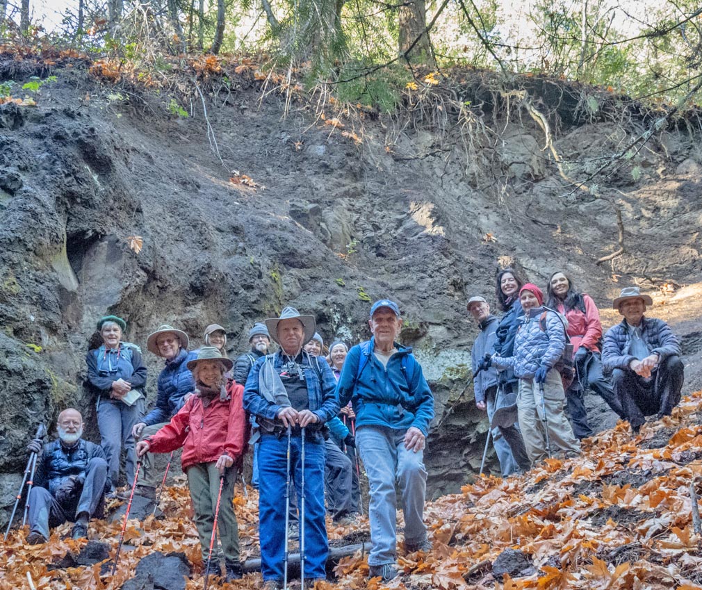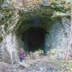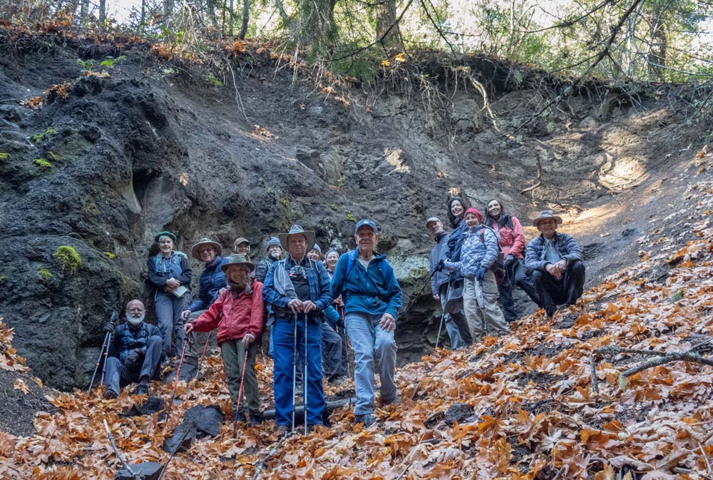 We headed down the west side of the trail until we came to the arrow made of branches pointing to our turn-off for the more developed west portal of the tunnel project. This portal is about 20′ high and 15′ wide and goes back about 150′. We have had lunch there on past hikes, but with the sun out warming temps to 60 the group decided to climb up the north hillside of the tunnel for lunch with a view of I-5 heading up towards Siskiyou Pass.