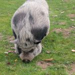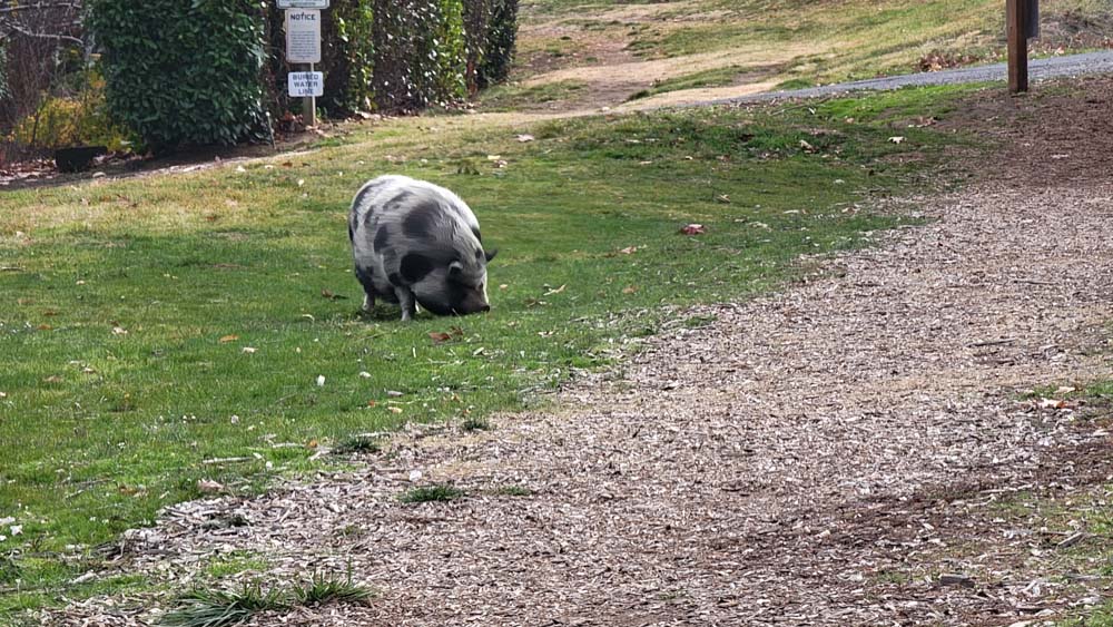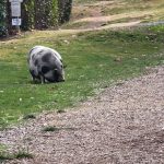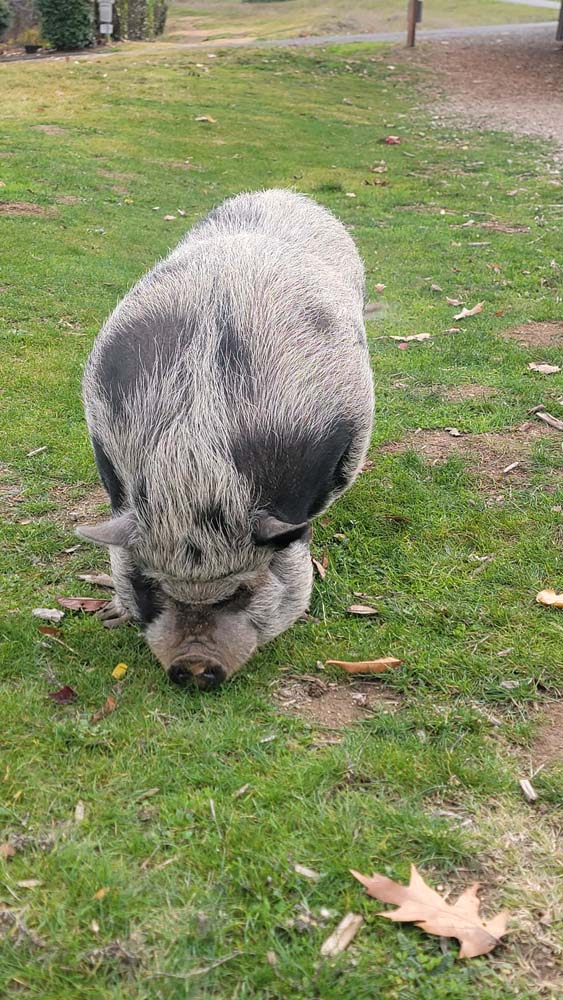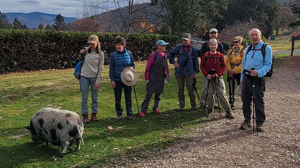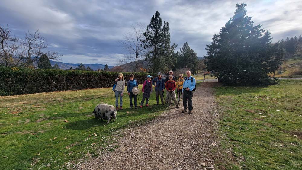 We headed up the Oredson Todd Woods trail and connected to White Rabbit. We had a quick snack at the big parking area then headed back to the trailhead where we were met by Gizmo the pig. I was able to pet Gizmo, but when others tried she snapped at them. She was willing to be in our group photo though.