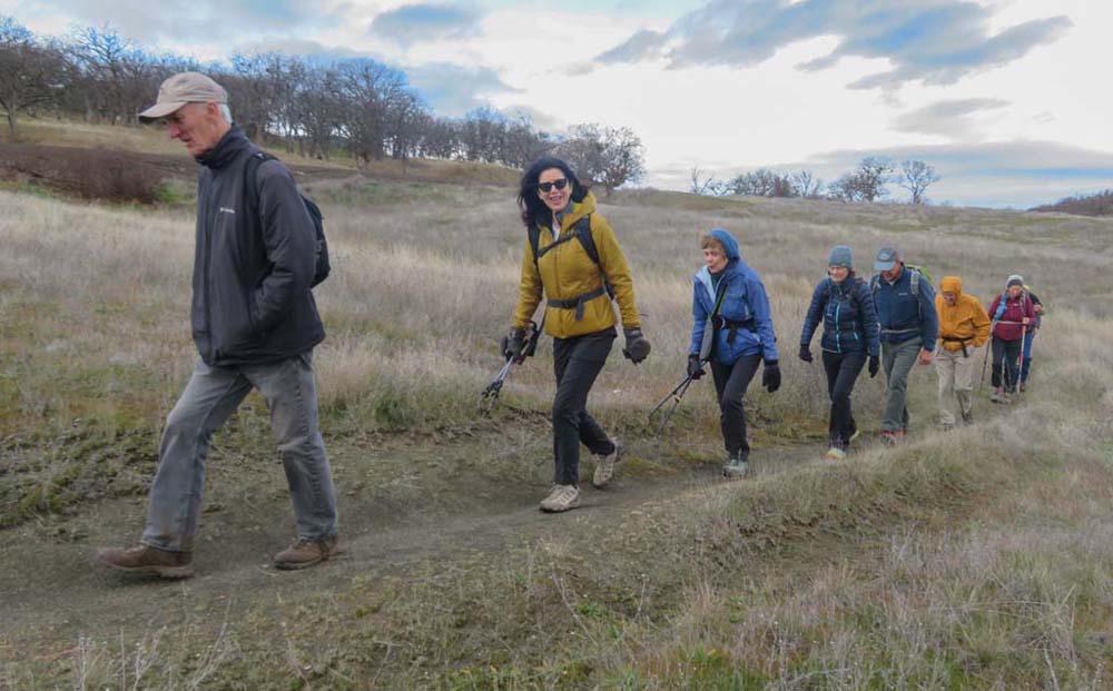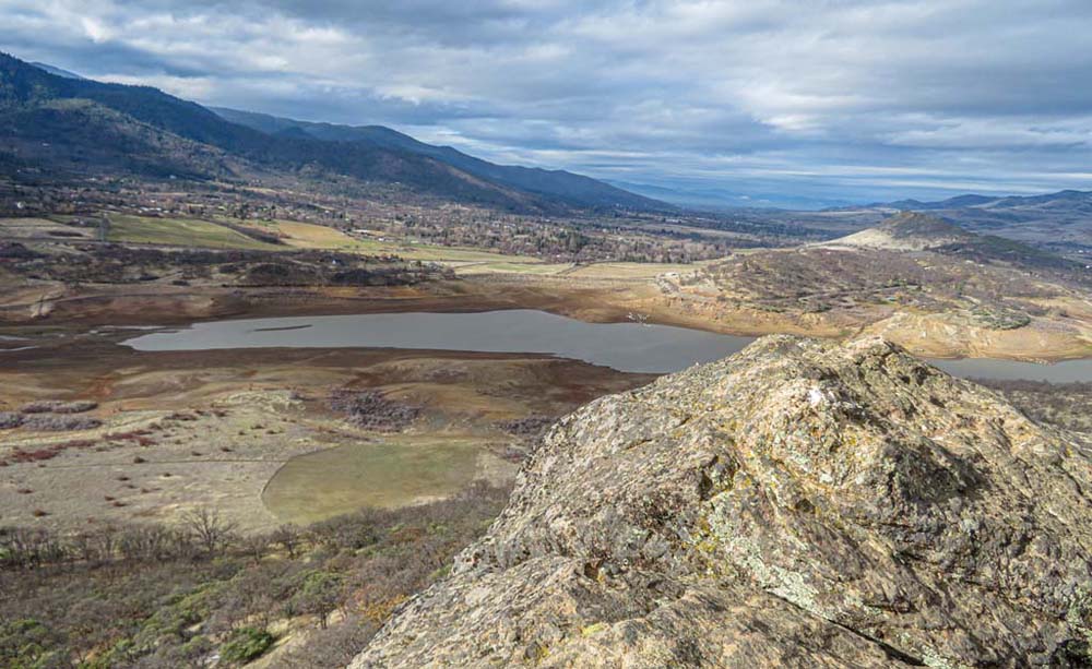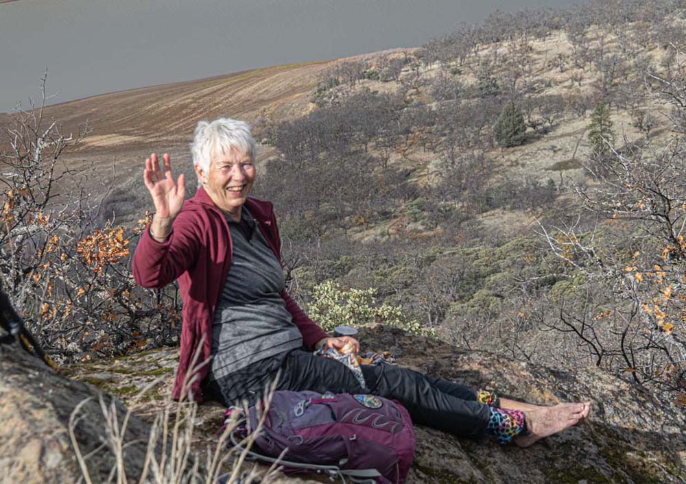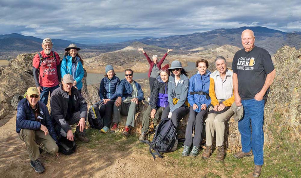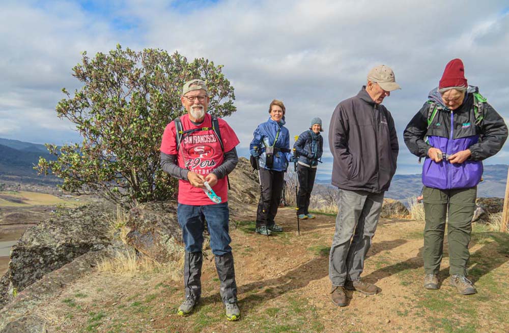 After a rest stop back at our original parking lot, we headed east on the Spur Trail and south towards Songer Butte. The group was in good spirits with the sun now out lighting up the way to the summit. The wind and sun had blow-dried the steep trail up to Songer making the 600′ of elevation gain less slippery. From the top of Songer Butte (2,700′) we had 360-degree views of the lake, the valley, and the surrounding mountains.