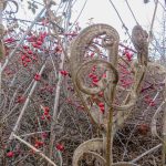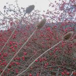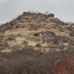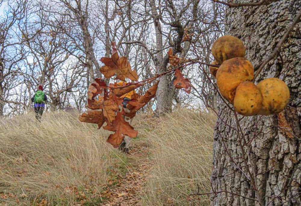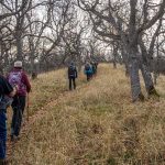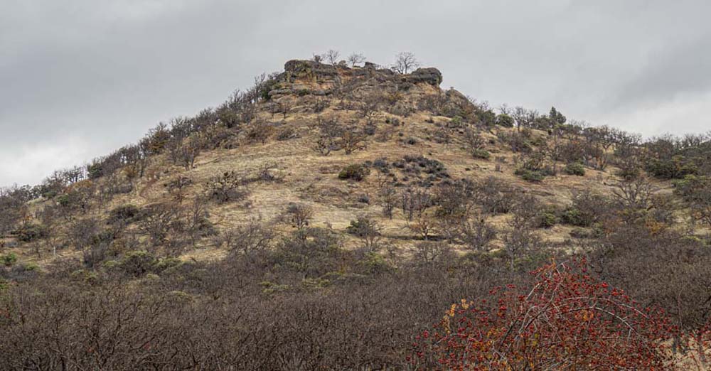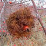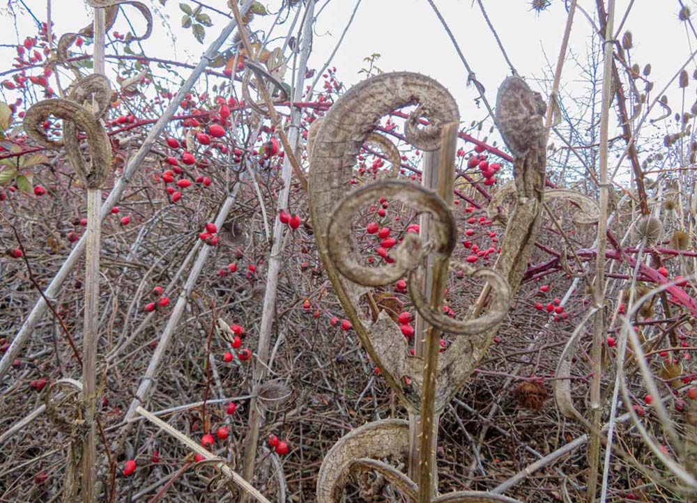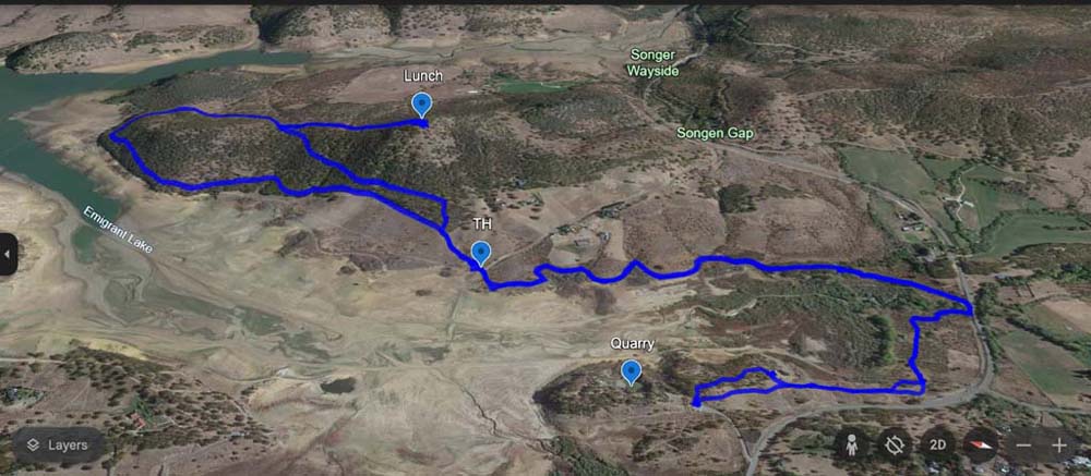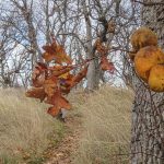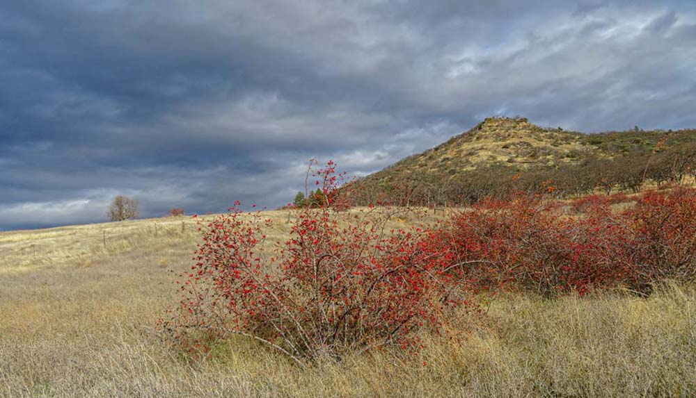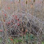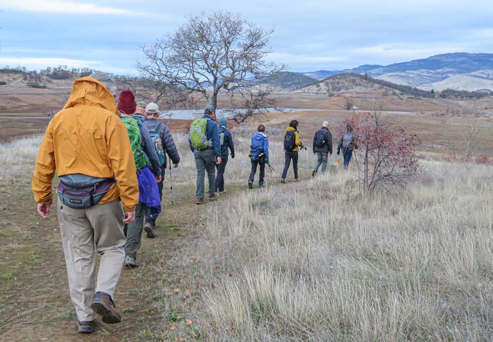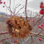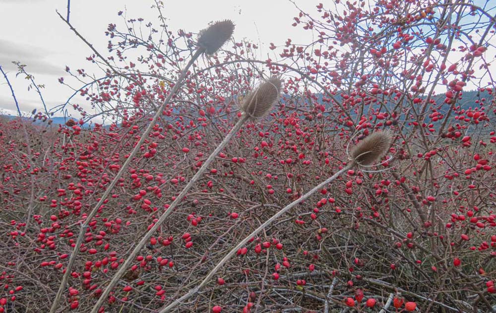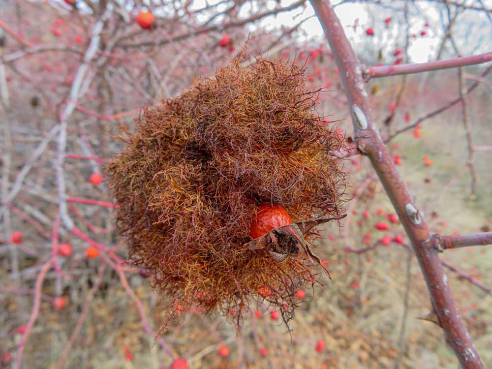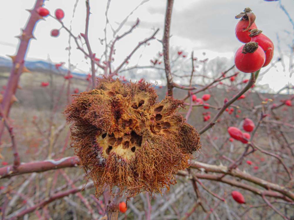 Temperatures were in the 50s with a brisk wind as we set out from parking for the Quarry Trail hike across the road. The trail runs parallel to the Greensprings Spur road and back towards Highway 66 along the dried lake shoreline. We saw some late-season plants along the trail including long-stemmed Teasels and countless wild rose shrubs now showing their bright red rose hips. A discovery was fuzzy balls at the end of the rose shrub branches. For now, we are calling them wild rose galls, somewhat similar to Oak galls; possibly formed by the sting of local Hornets.