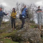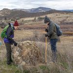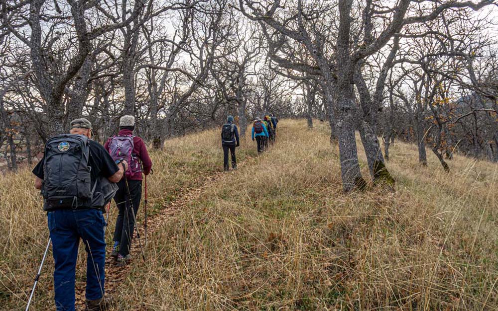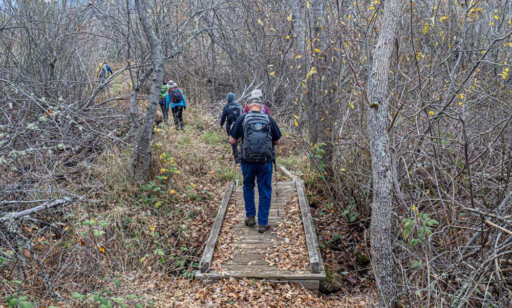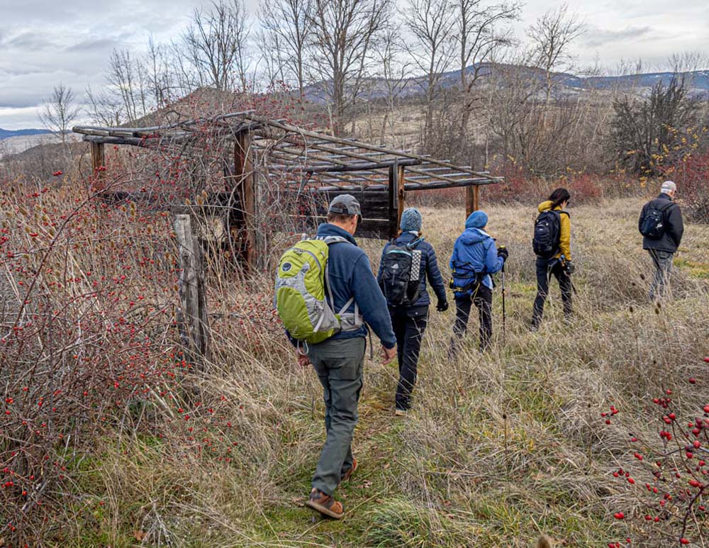 We followed the trail up to a hilltop where many in our group of 13 were mystified by what they saw. Metal stands with chains hanging down spaced around the hilltop and down in the meadow. Were these grave markers or transmitters for UFOs? Ha! No, these were the holes for a disc or Frisbee golf course. With a good aim, the Frisbee hits the chain and then falls into the basket below for the score. Many in the group were incredulous never having heard of such an activity.