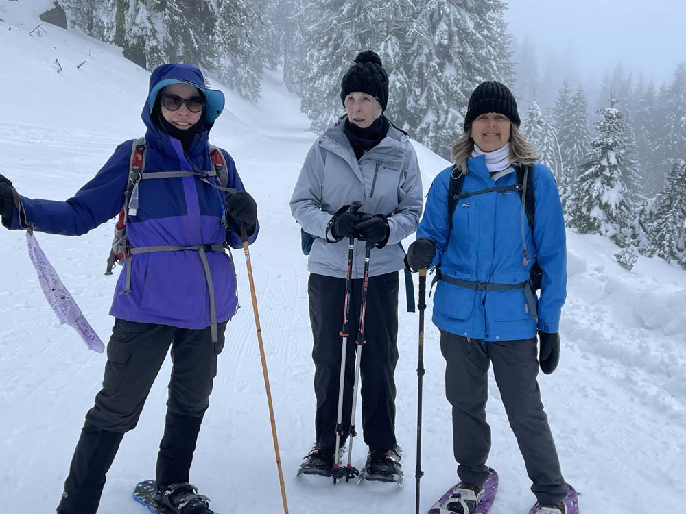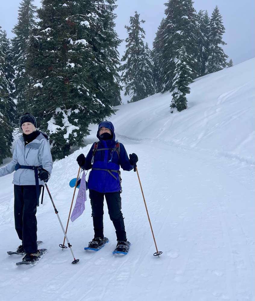 We planned to snowshoe at Moon Prairie, but other snowshoers reported that the trail had deteriorated the past few days due to warming temperatures and rain. We headed to Mt. Ashland hoping for a better trail at the higher elevation. All concerns about melting snow vanished as we headed out on the groomed trail on FS20. There was much snow on the mountain and the trail was groomed with a top layer of recent snow.