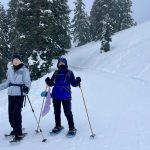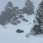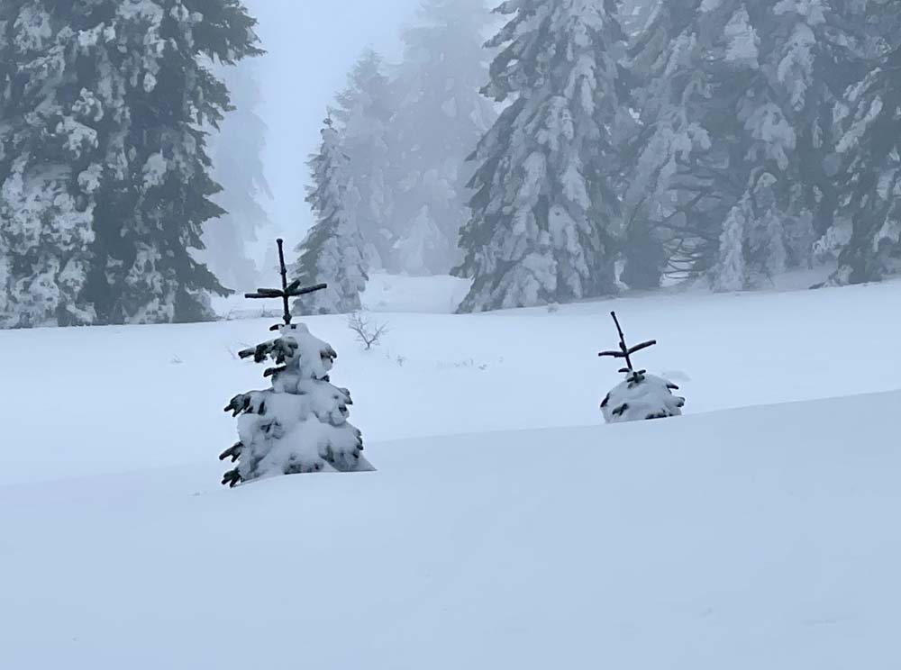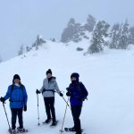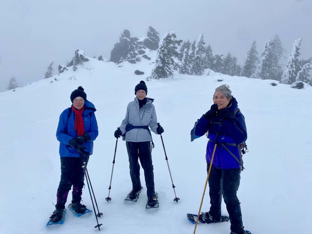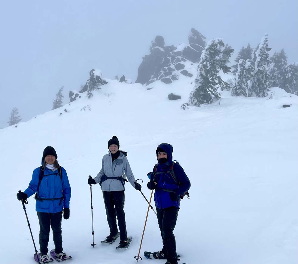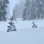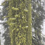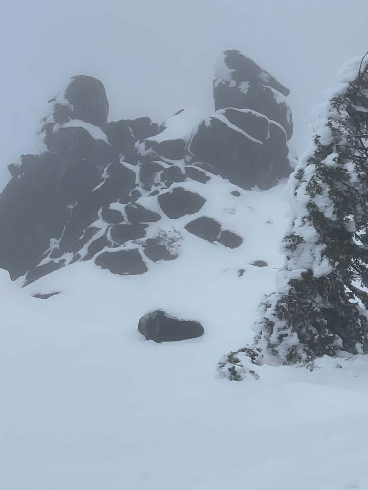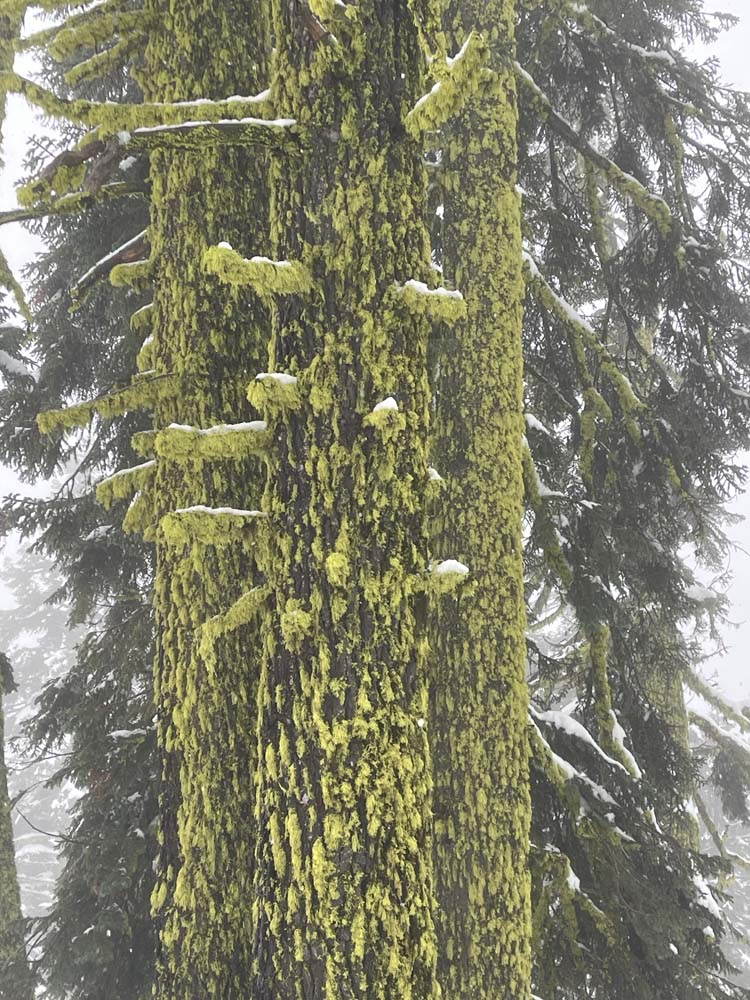 Visibility was limited due to fog. Everything looked white. Our intrepid group of four trekked on, past trees covered with moss. Trees close to the trail shedded snow and pelted us with wet snow drops. It was too stunning to turn around, so we kept going up the road to Mt. Ashland Summit to the Rabbit Ears rock formation.