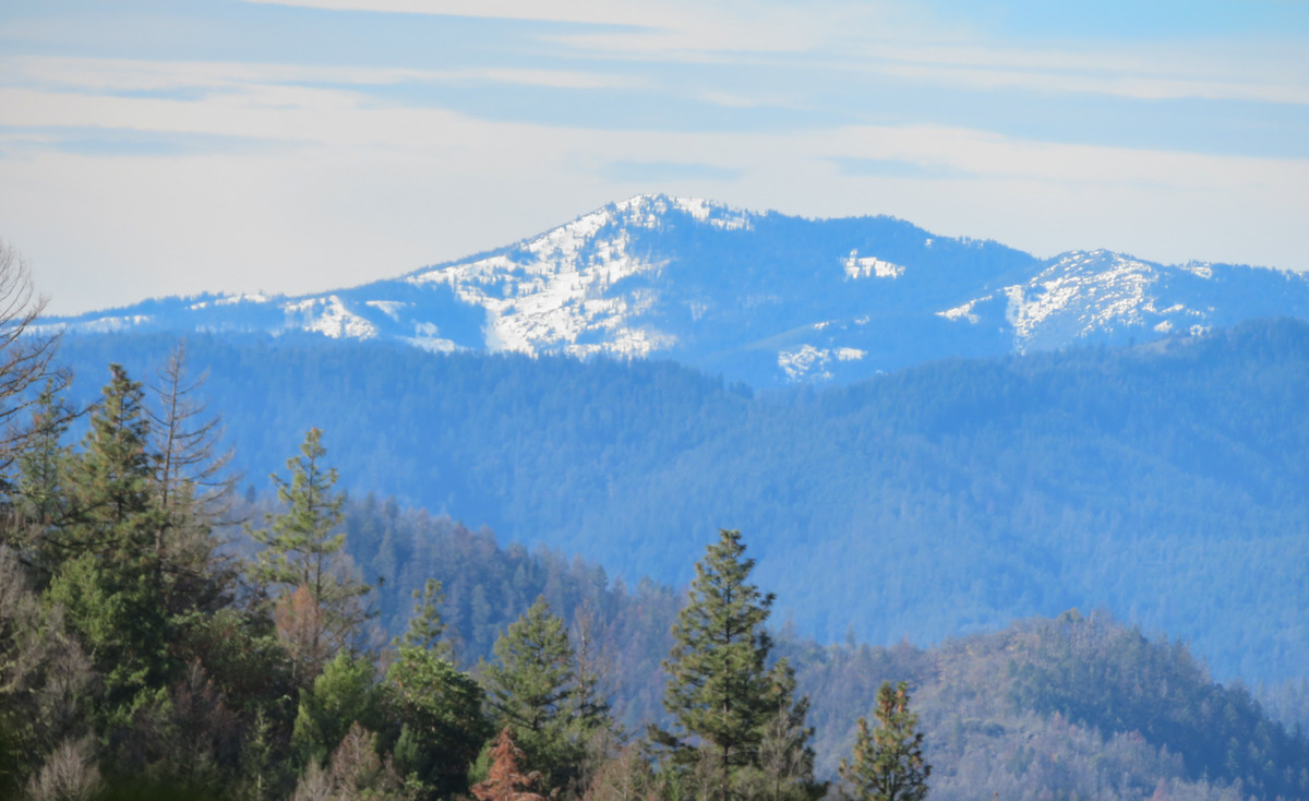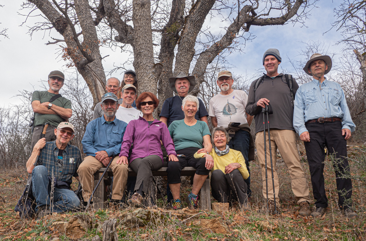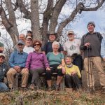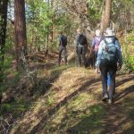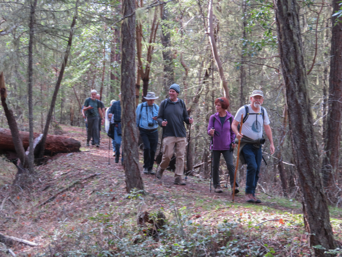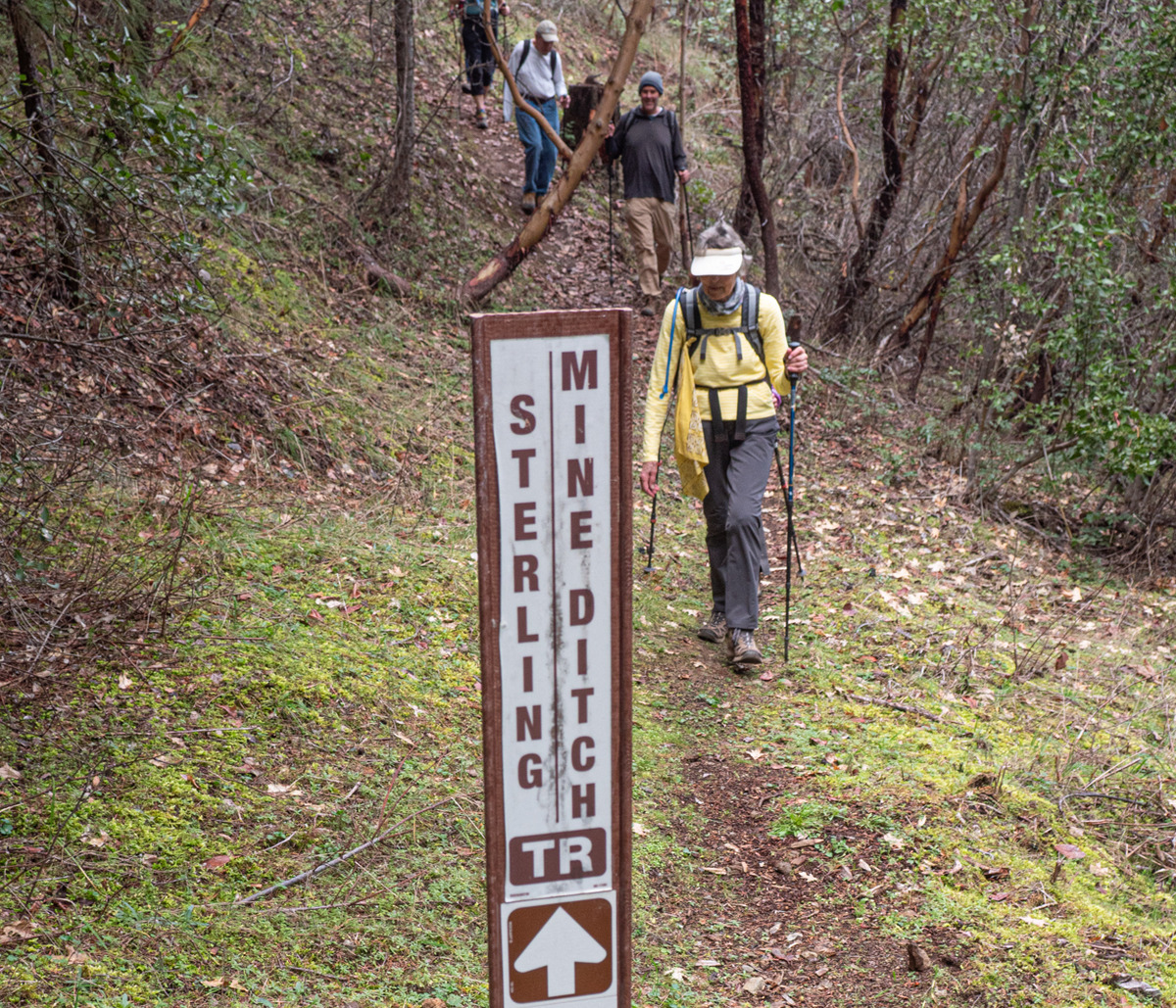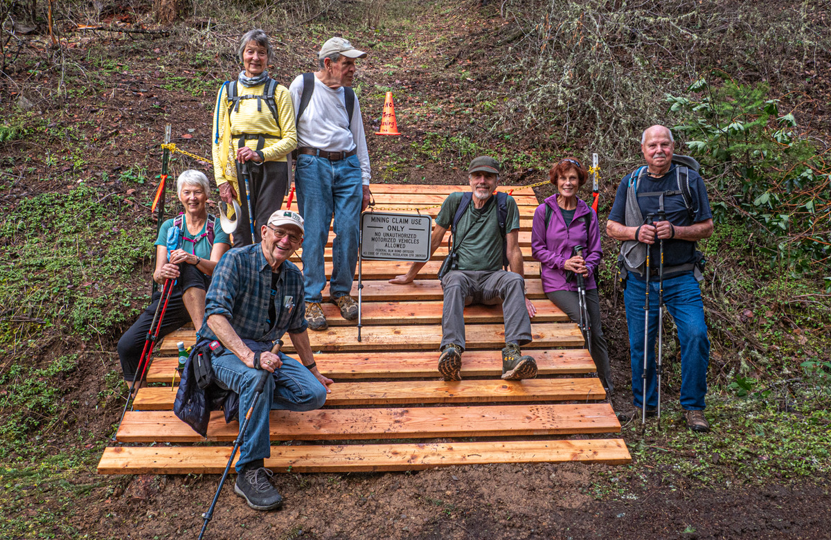 The Monday group closed out January with temps in the 60s hiking on the Sterling Mine ditch trail. It was sunny and felt like Spring for our 7.5 miles. We started on the Demming Gulch trail, then hiked up the Grub Gulch trail, and finished on a new 2-mile stretch of the Jack Ash trail. Walking next to the old mining ditch, we told new hikers about the hydro mining for gold in the late 19th century. The forested trails were green with lichen in the trees, moss, ferns, and early green growth along the way. The Demming trail ends at a locked gate, but a sharp turn to the right starts the ascentĀ up the Grub Gulch trail with lunch near the top and a view of Little Applegate Valley and the snow-covered peaks to the south. We had our group taken around the bench at the lunch spot.