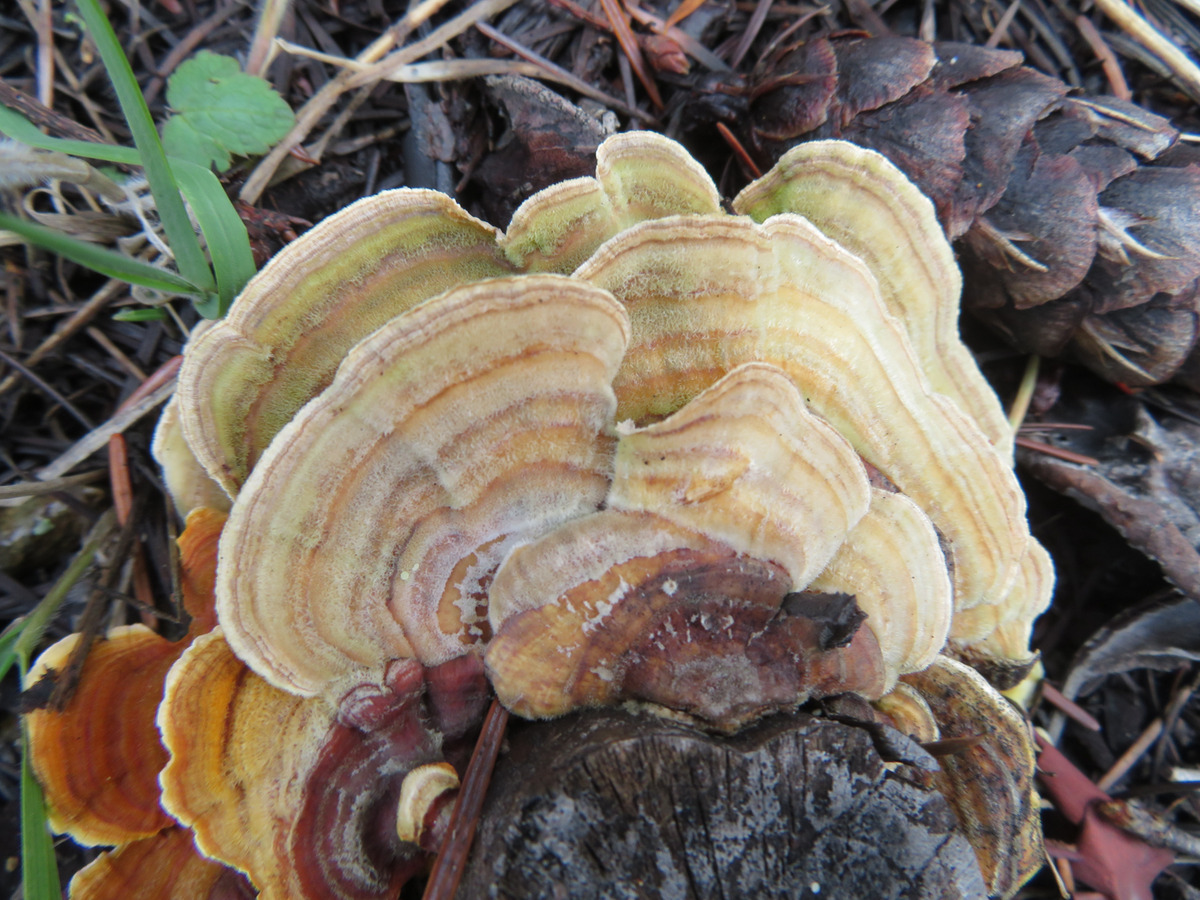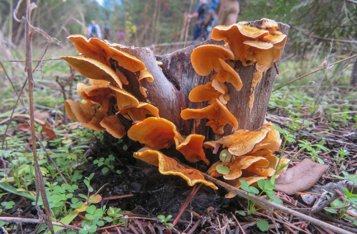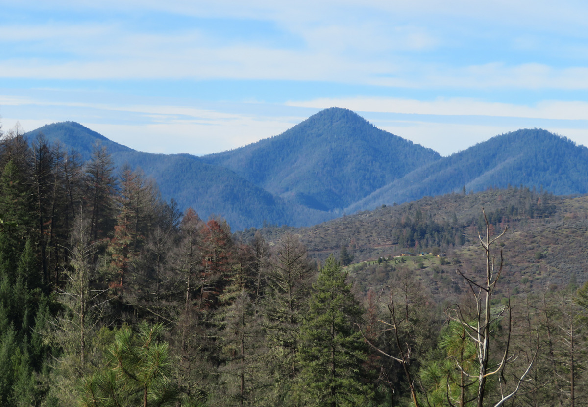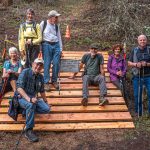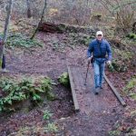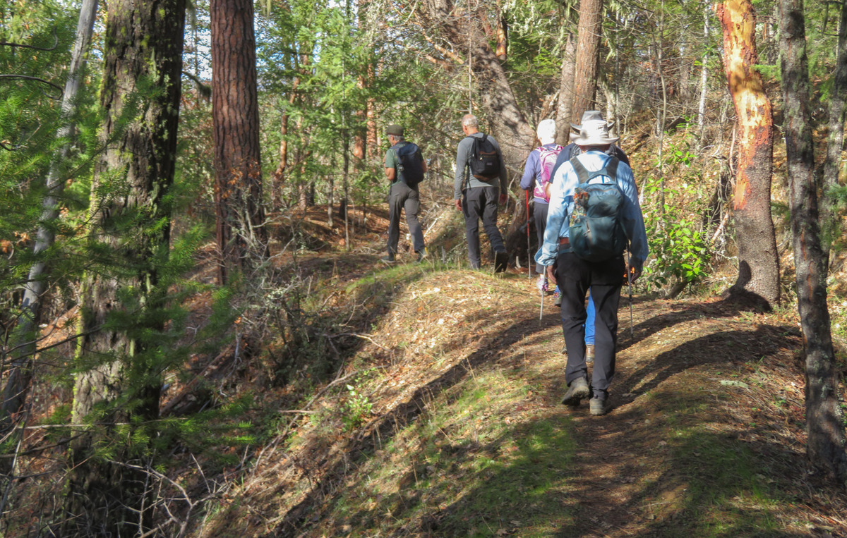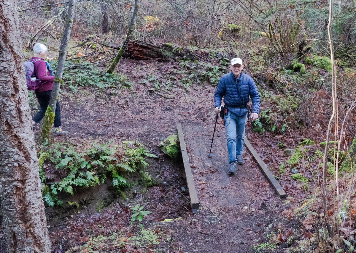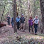 The Monday group closed out January with temps in the 60s hiking on the Sterling Mine ditch trail. It was sunny and felt like Spring for our 7.5 miles. We started on the Demming Gulch trail, then hiked up the Grub Gulch trail, and finished on a new 2-mile stretch of the Jack Ash trail. Walking next to the old mining ditch, we told new hikers about the hydro mining for gold in the late 19th century. The forested trails were green with lichen in the trees, moss, ferns, and early green growth along the way. The Demming trail ends at a locked gate, but a sharp turn to the right starts the ascentĀ up the Grub Gulch trail with lunch near the top and a view of Little Applegate Valley and the snow-covered peaks to the south. We had our group taken around the bench at the lunch spot.