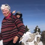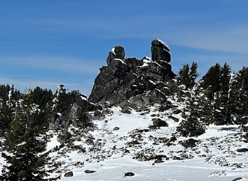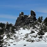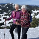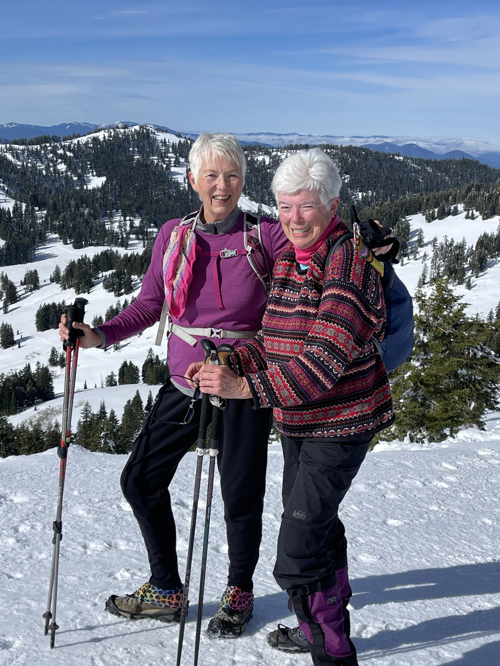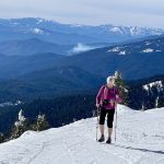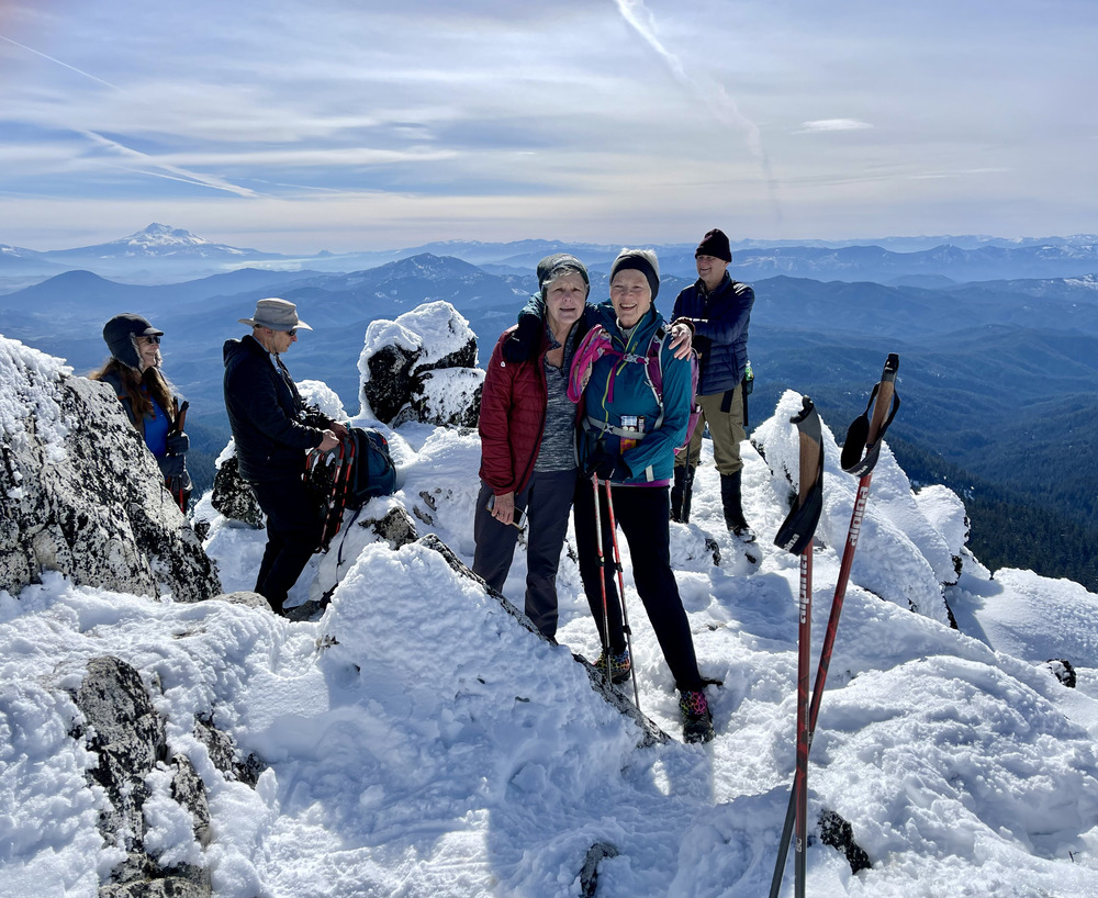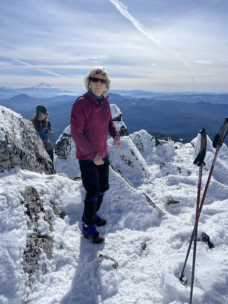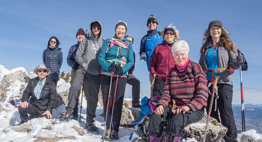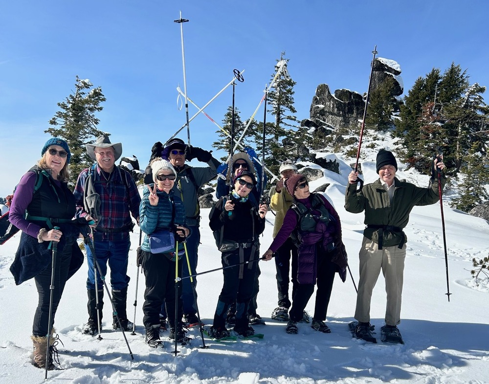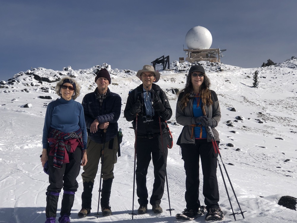 Some of us get trekking up the groomed road past Rabbit Ears to see the view into California. The allure of going to Mt. Ashland summit (elevation 7,532 feet) on a brilliant, sunny day was enticing. So, we kept going, encouraged by our spirited team. We climbed past the “golf ball” to the top of the Mt. Ashland ski lift and up to the highest rocks. There were vast views across the Rogue Valley and beyond where we could see the Crater Lake peaks, and down to a small Pilot Rock below. see the Crater Lake peaks, and down to a small Pilot Rock below. Many comments were heard about the exhilarating climb and how fortunate we are to live in such a stunning landscape. Total mileage – 5.6 miles.