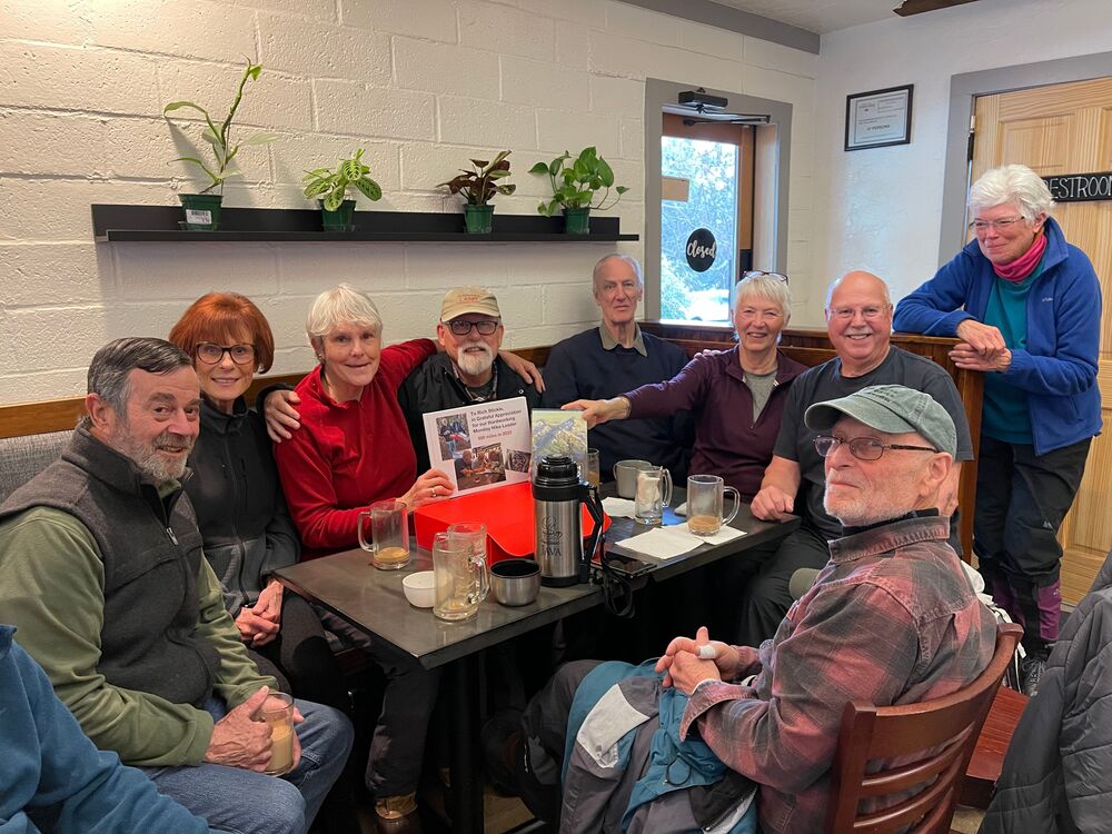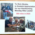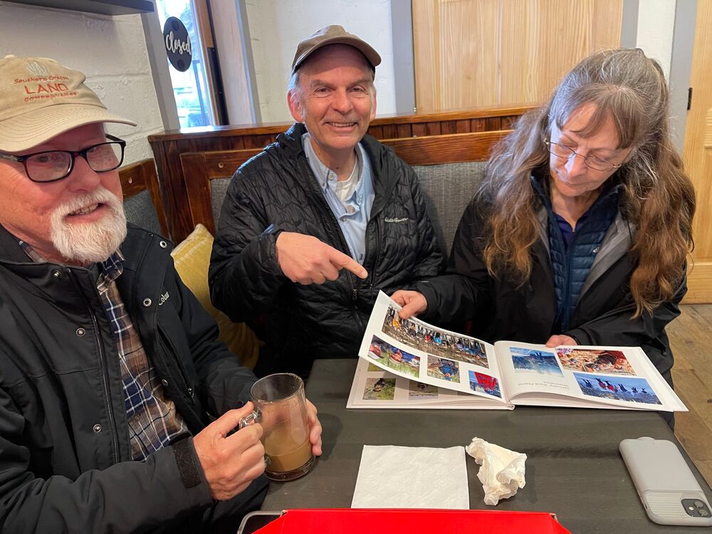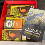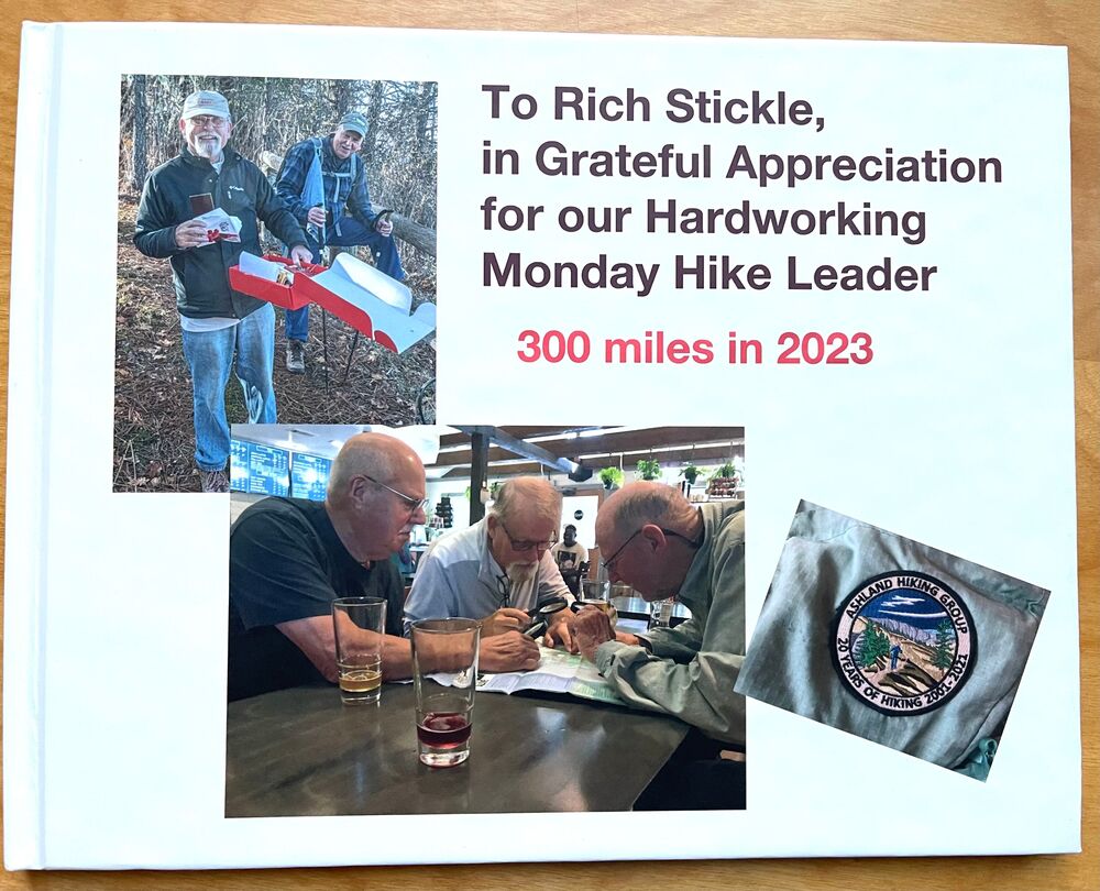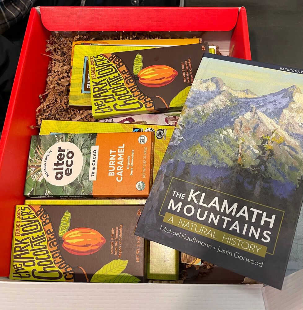 That proved fortunate as more hike members began showing up. Finally, Liz presented me with the box saying, “Open it and you’ll have to do some digging.” I’m a little dim when it comes to Liz’s surprises, but after figuring out how to get the box open my eyes gazed upon countless chocolate bars for our hikes…Great! Then as I moved the bars around I found an excellent naturalist book called “The Klamath Mountains”…better still! Then Liz said, “Keep digging.” So under layers of shredded paper, I found a flat white photobook of our 2023 hikes…Wow, that’s the best!