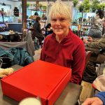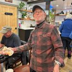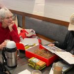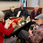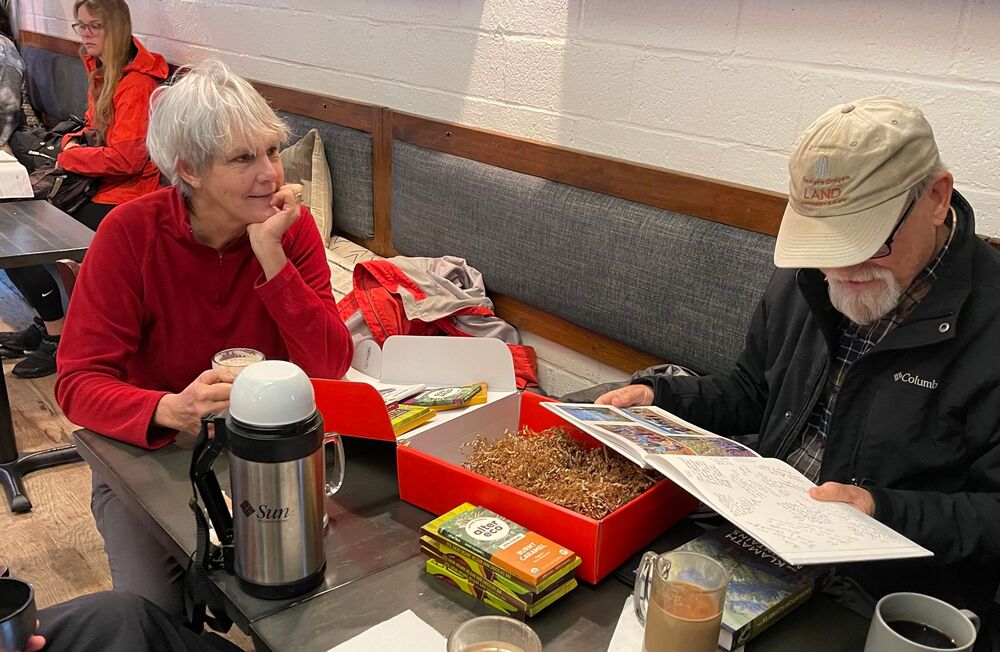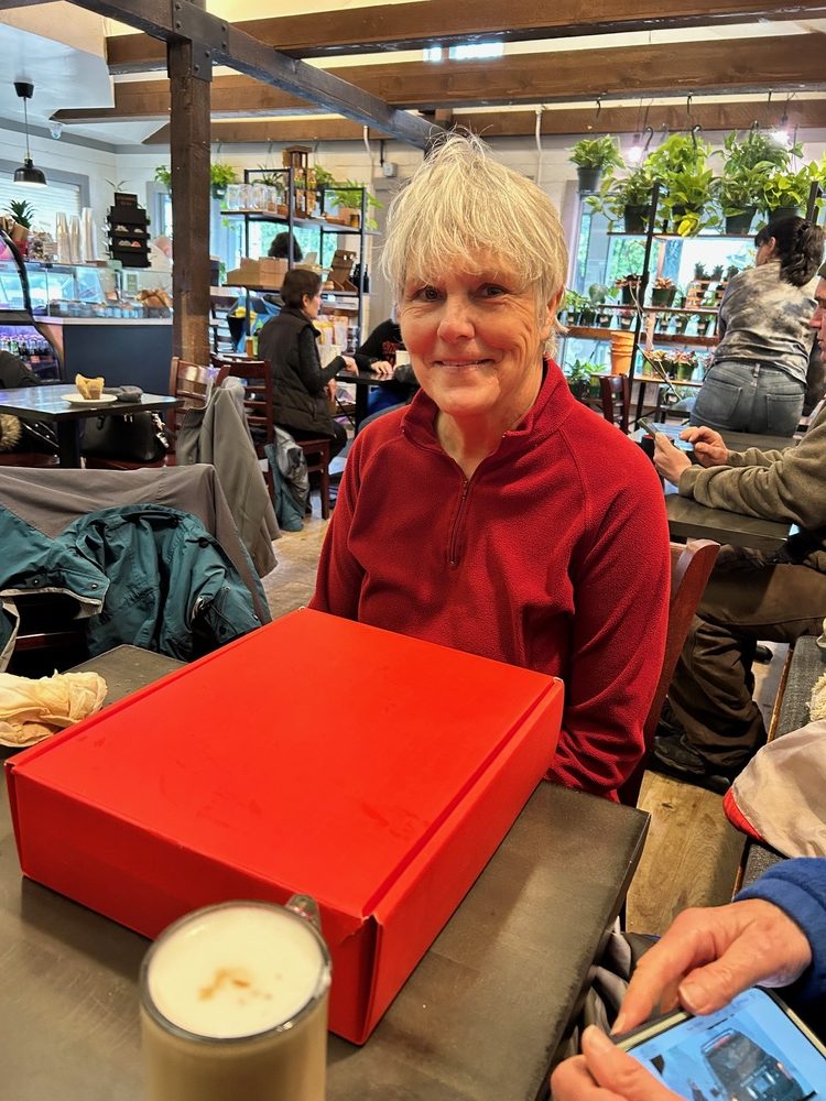 Liz came in carrying a large flat red box; “Did you stop for donuts, I queried?” “No, feel how heavy it is,” she replied. Ah, it must be sinkers” I joked. While our comedy act was taking place, two more tables became available.