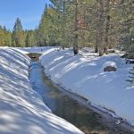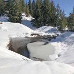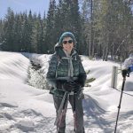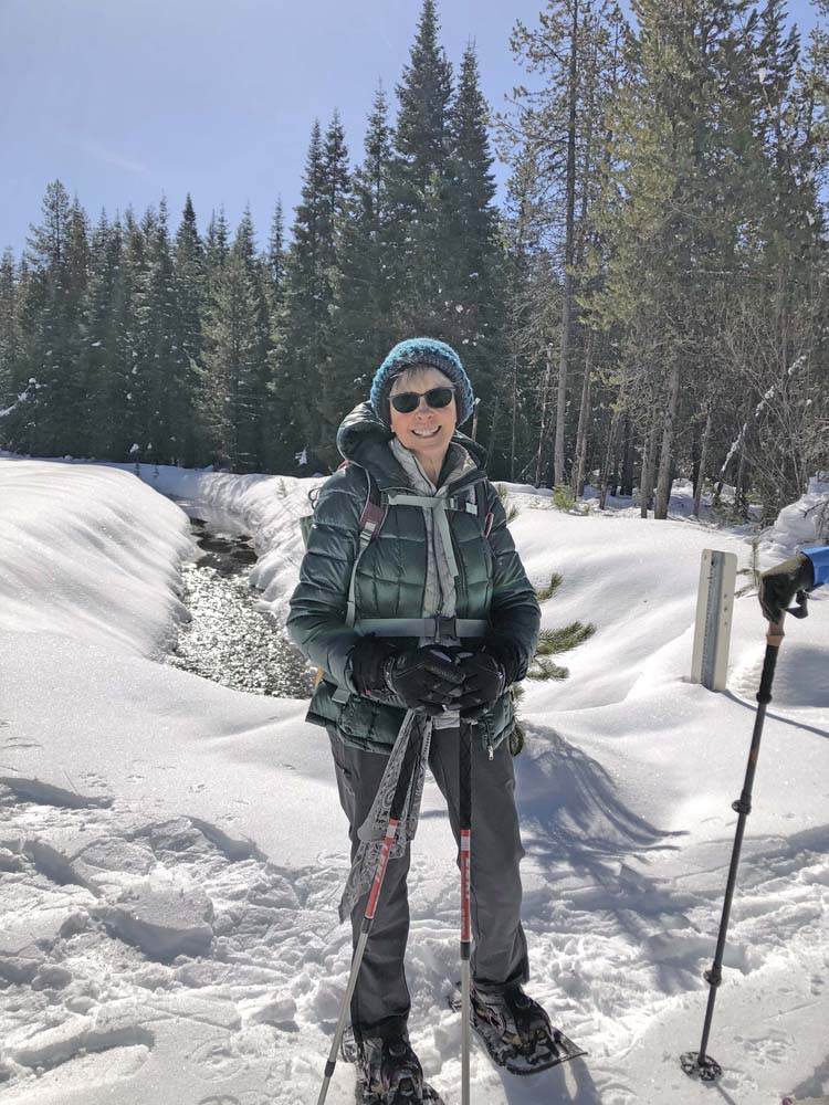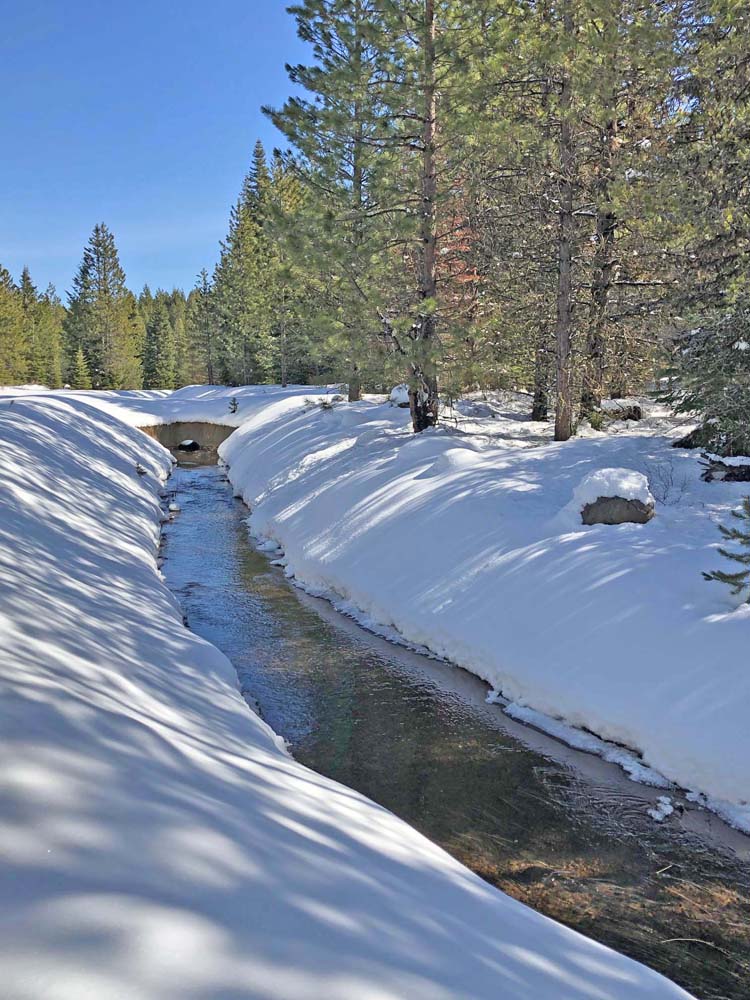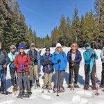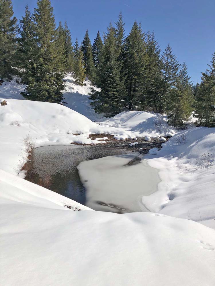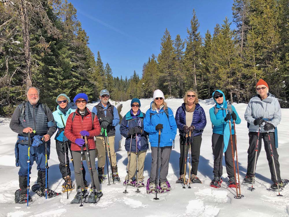 On this beautiful clear blue-sky day with ample snow cover, ten of us snowshoed in the Deadwood Nordic area off of Indian Memorial Road. After parking and navigating over the berm on FS Road 37, we followed the snow-covered road to the intersection with the Daley Creek Canal. We turned and broke trail following along between the Canal and beautiful evergreen trees.