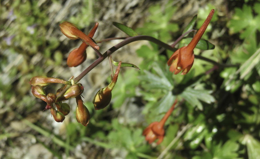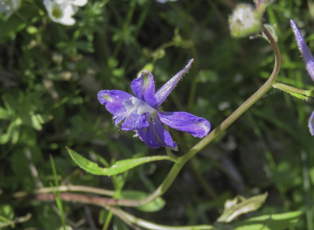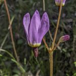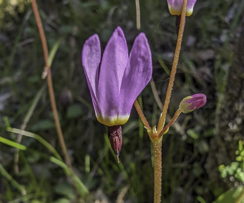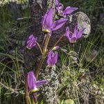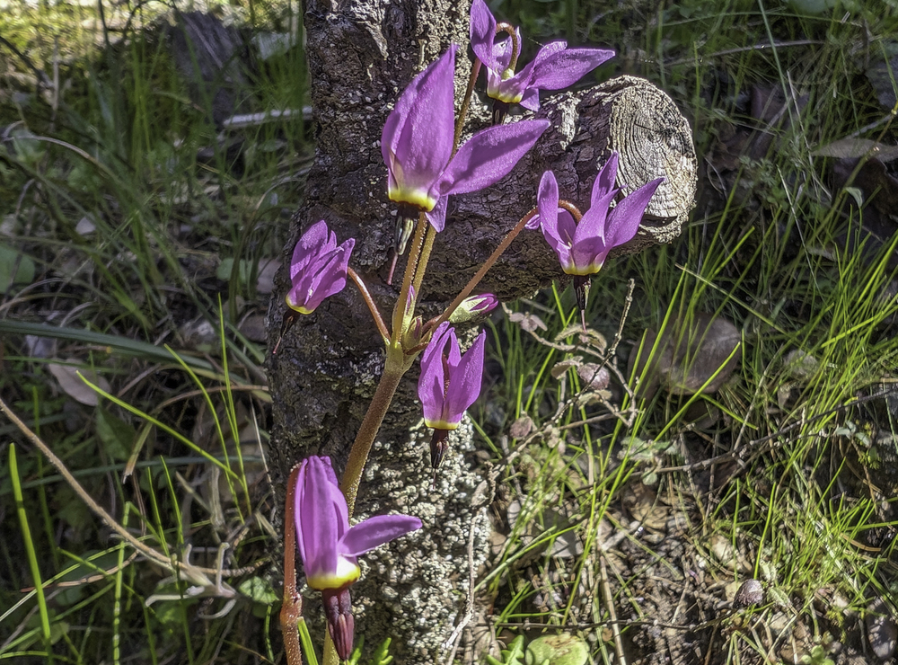The trail quickly climbs up about fifty feet from parking where you get your first view down the green river and see the first of many early spring wildflowers. Growing from water seeping through the cracks on the cliff face were yellow Monkey Face flowers (Seep Mimulus); pink ball flowers (Rosy Plectritis), blue flowers with telltale spurs (Larkspur), normally white but showing a periwinkle shade (Milk Maids or Tooth Wort), yellow shiny leaf (Western Buttercup), perhaps the beginnings of Scarlet Gilia, Red Bells or Scarlet Fritillary, and Henderson’s Shooting Star pointing towards earth.