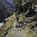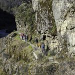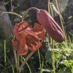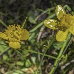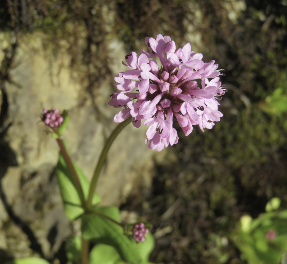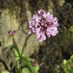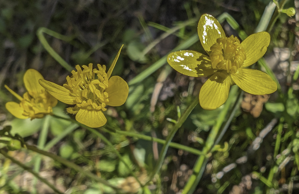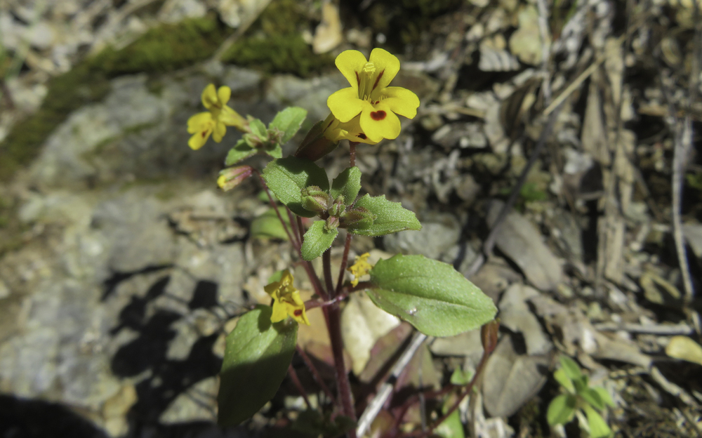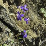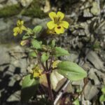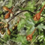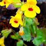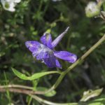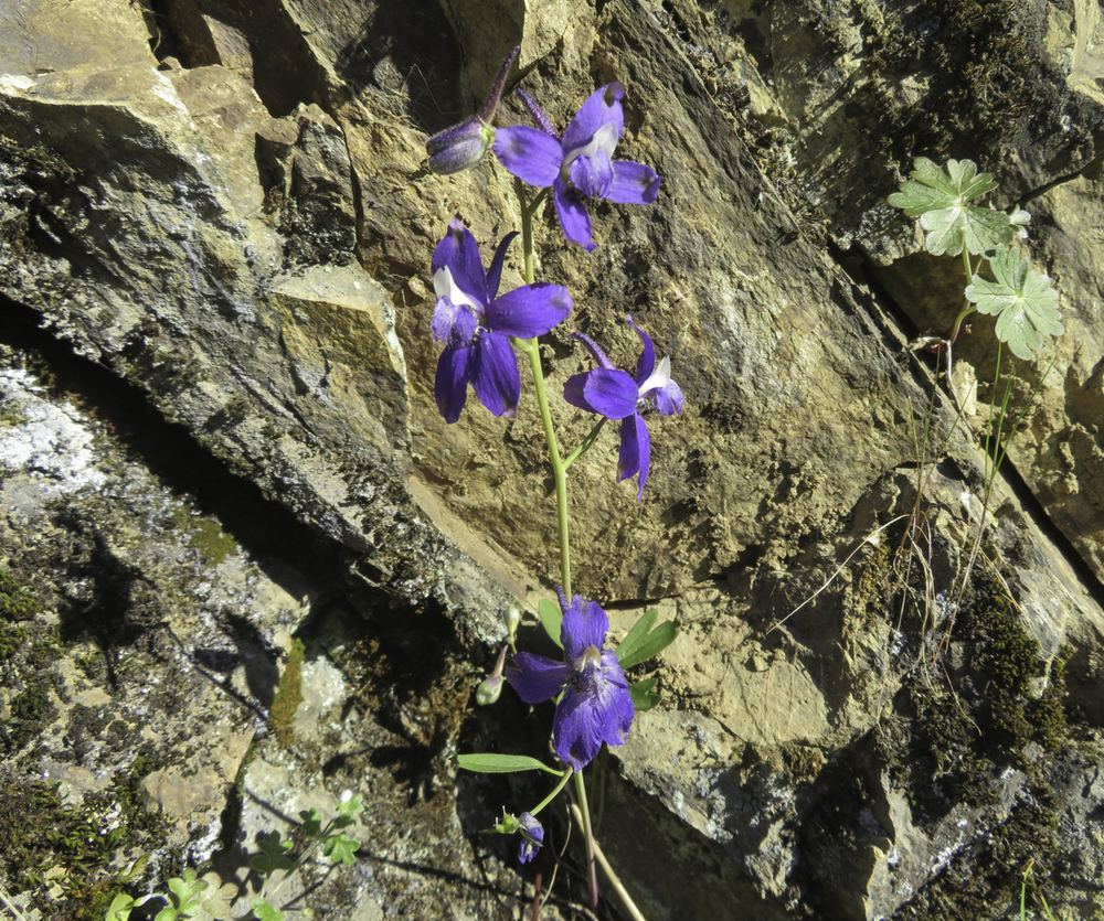 The trail quickly climbs up about fifty feet from parking where you get your first view down the green river and see the first of many early spring wildflowers. Growing from water seeping through the cracks on the cliff face were yellow Monkey Face flowers (Seep Mimulus); pink ball flowers (Rosy Plectritis), blue flowers with telltale spurs (Larkspur), normally white but showing a periwinkle shade (Milk Maids or Tooth Wort), yellow shiny leaf (Western Buttercup), perhaps the beginnings of Scarlet Gilia, Red Bells or Scarlet Fritillary, and Henderson’s Shooting Star pointing towards earth.