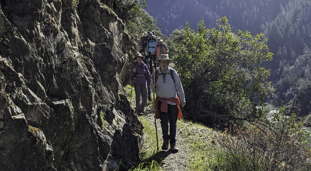 At parking, some were wondering if they had brought enough clothes as a cool morning breeze blew through. But once up on the trail the breeze stopped and we could feel the welcomed sun. So it was a very lucky day to be out hiking the Lower Rogue and not a day for layers but for sunscreen and sun hats.