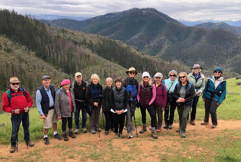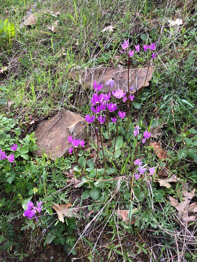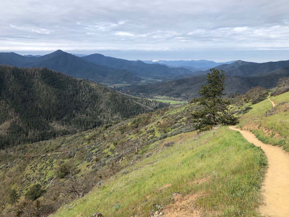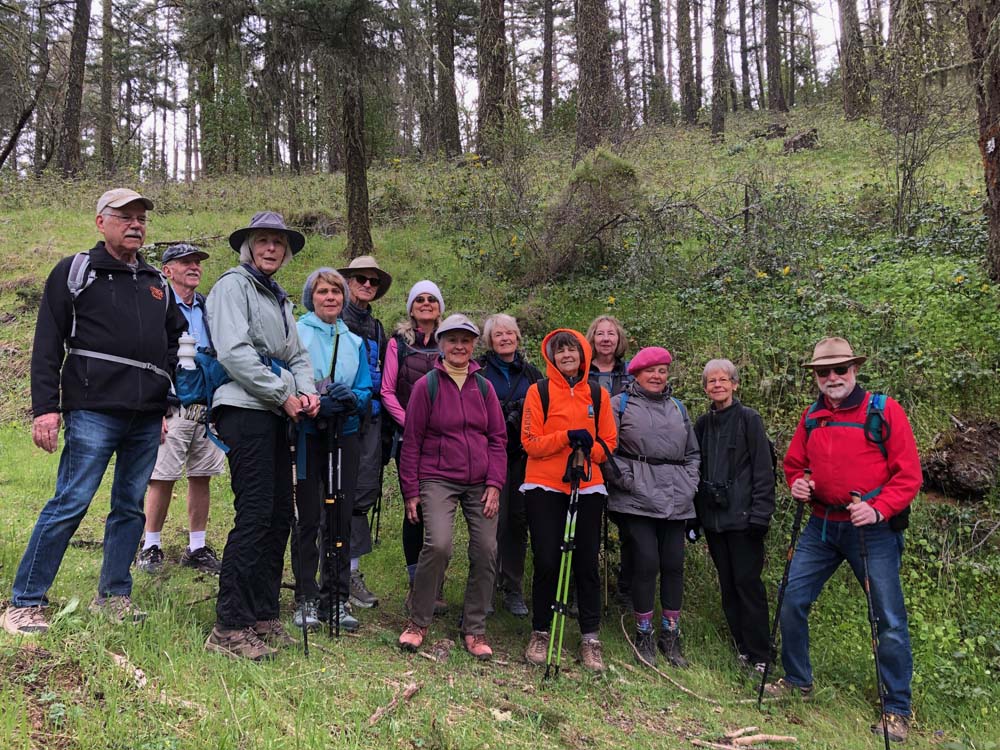We enjoyed welcoming a new hiker and some who’ve not been with us for some time. Fourteen (14) of us hiked the East Applegate Trail from the TH to the high point round trip, totaling 5½ miles with 700’ elevation gain. It was an overcast day but not so much as to obscure beautiful views across the landscape to the south and west of the Siskiyou mountain range with many peaks and buttes, some with ample snow cover. The floor cover along the trail was covered with a panoply of beautiful wildflowers in full bloom. Among them: Western Butter Cup, Fiddleneck, Crains Bill, Shooting Star, Fawn Lilly, Blue Dick, Fritillaria (Red Bell), Oregon Grape, Whiteleaf Manzanita, California Poppy, Cat’s Ear, Miner’s Lettuce, Desert Parsley, Lupine, and Popcornflower. We enjoyed lunch, and of course chocolate, assembled along a log off the spur trail at the crest. With rain in the forecast for later in the day, we barely escaped it on the trail. With due respect for hikers, it held off until we were in our cars headed home. It was a magnificent hike at the right time of year.