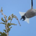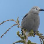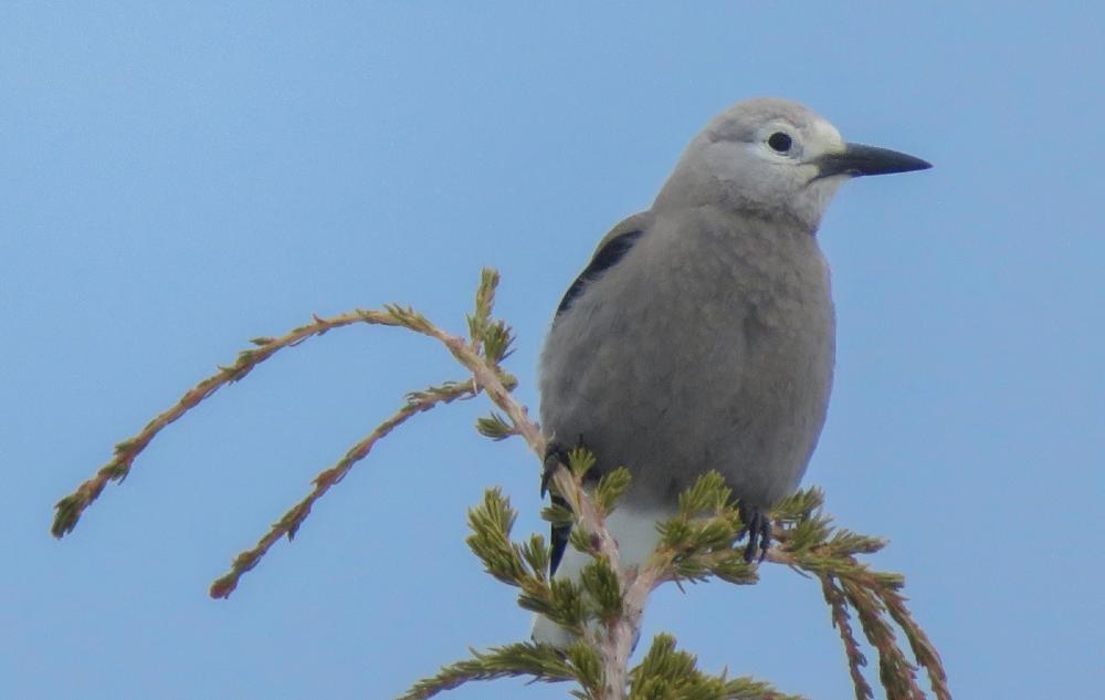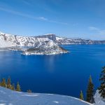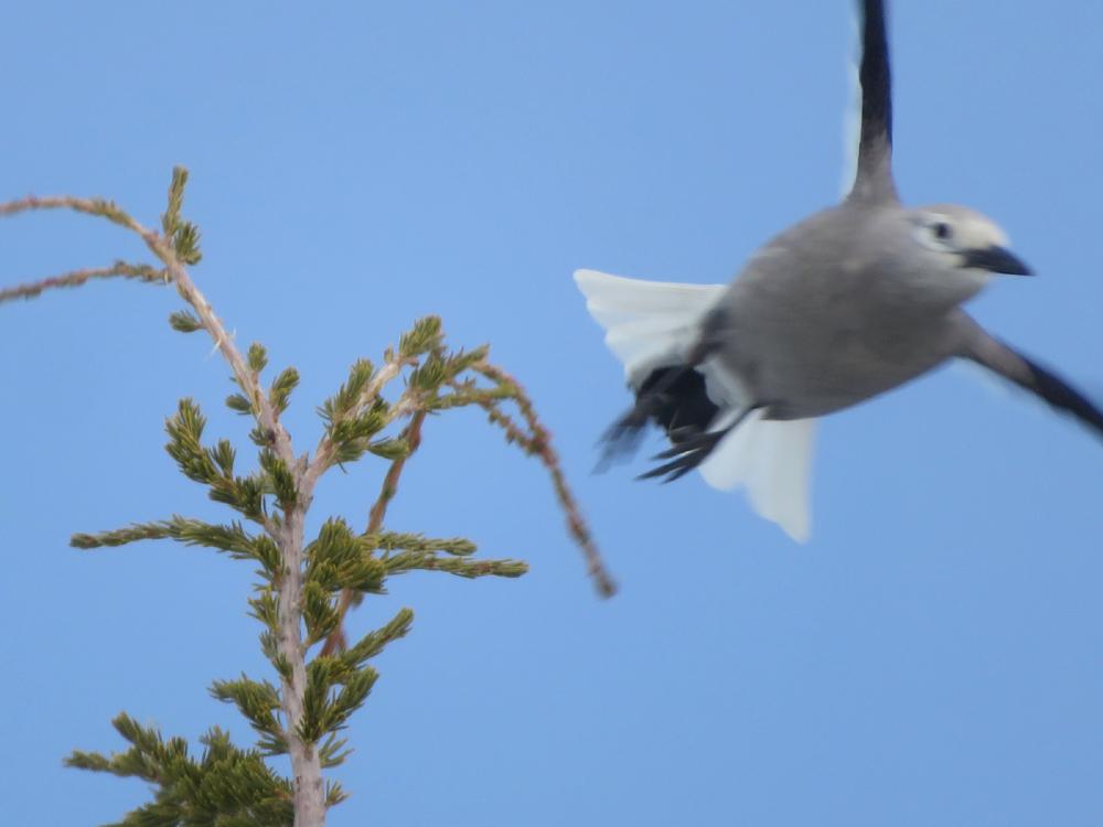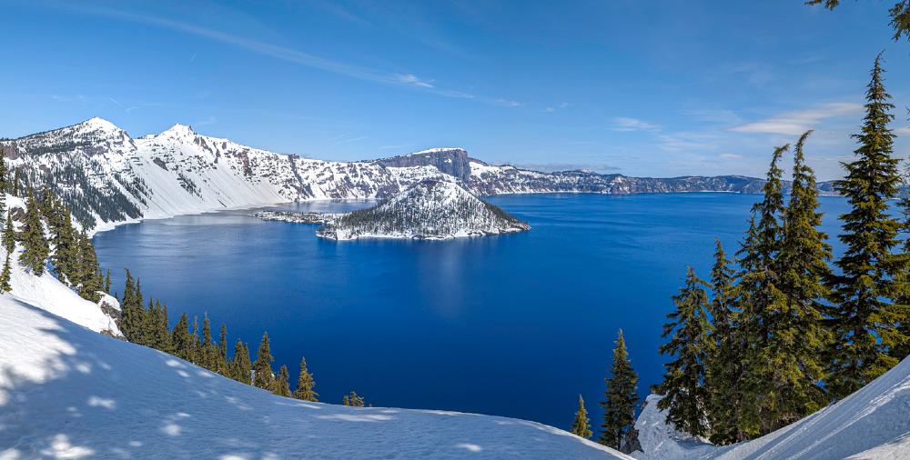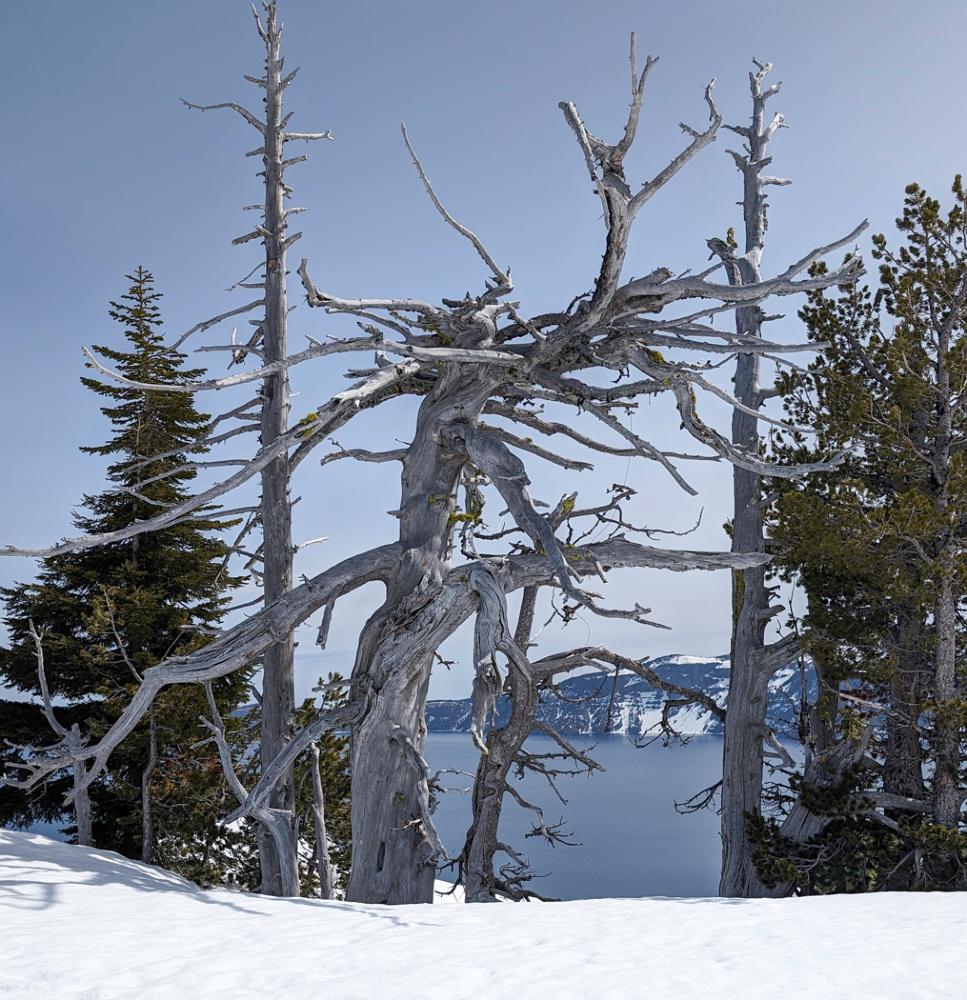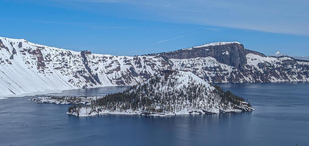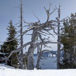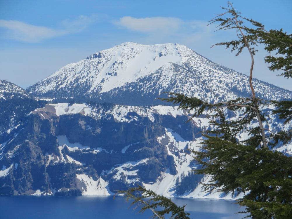 The sun warmed the air into the 40s by lunch as we viewed Wizard Island and were joined by a loud Gray Jay (Canada Jay) who swooped down from his perch atop a pine to gobble up nuts tossed on the snow.