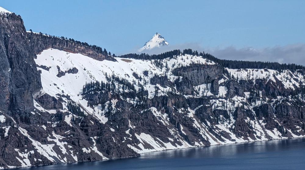 The clearing clouds offered great views around the lake as we headed towards Wizard Island. Clockwise we could see Watchman Overlook, Thielsen Peak rising over Diamond Lake about 20 miles beyond the rim, then Scott Mountain to the south, and finally Garfield Peak just beyond the Crater Lake Lodge.Β