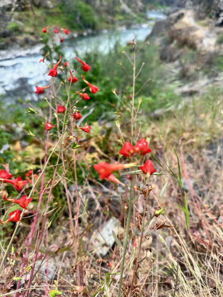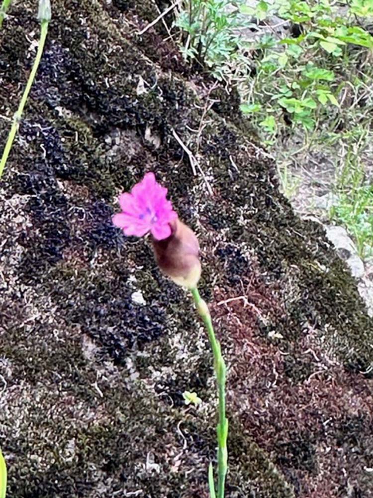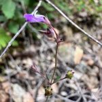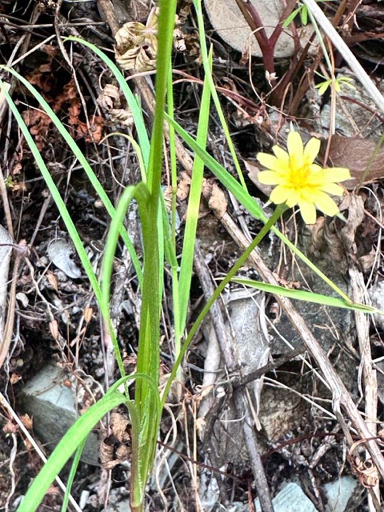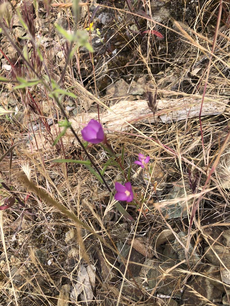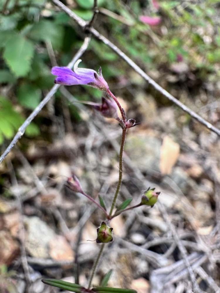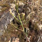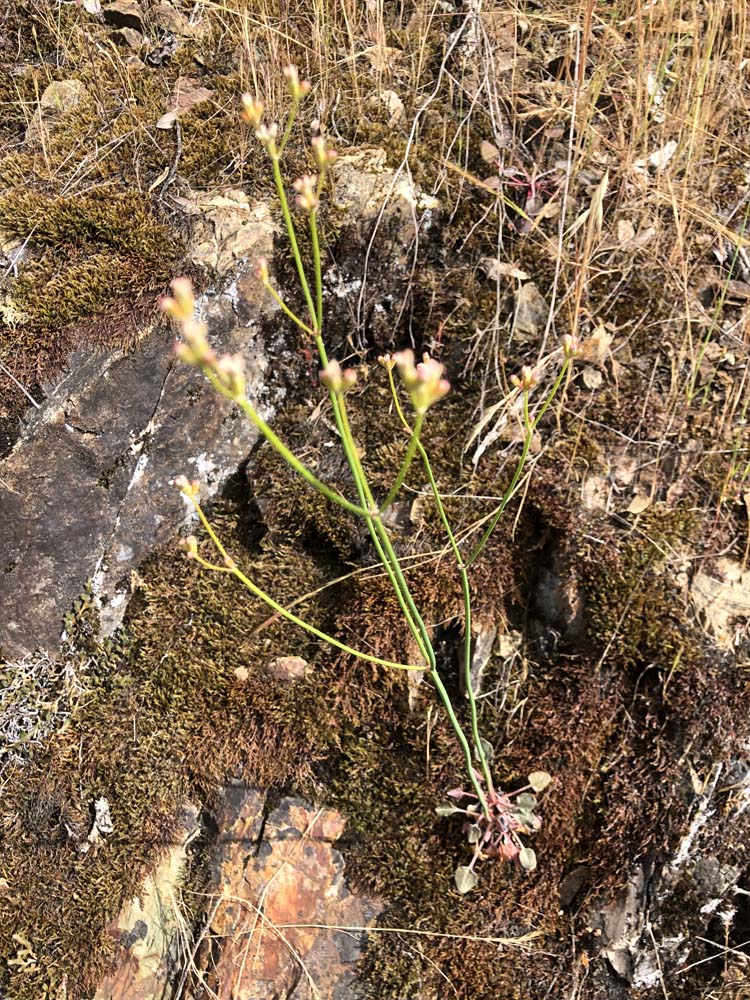 At the trail’s beginning, Eva was excited to see the Red or Canyon larkspur (Delpihinium nudicale) which she had not seen before. Just for starters, we encountered Common comandra (Comandra umbellata), Common whipplea (Whipplea modesta), Hairy pinks (Petrorhagi dubia), Marshall’s saxifrage (Saxifrage marshallii), and Silverback luina (Lunia hypoleuca), Cutleaf silverpuffs — on both its yellow dandelion-like flowers and its silver puff seedheads– (Microseris lacinata.