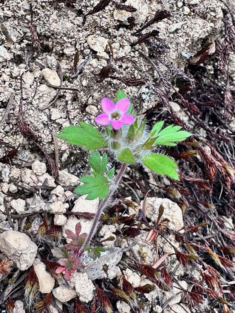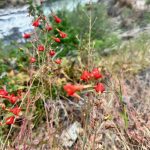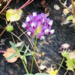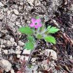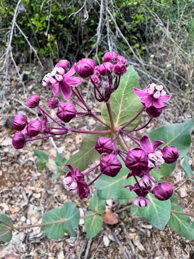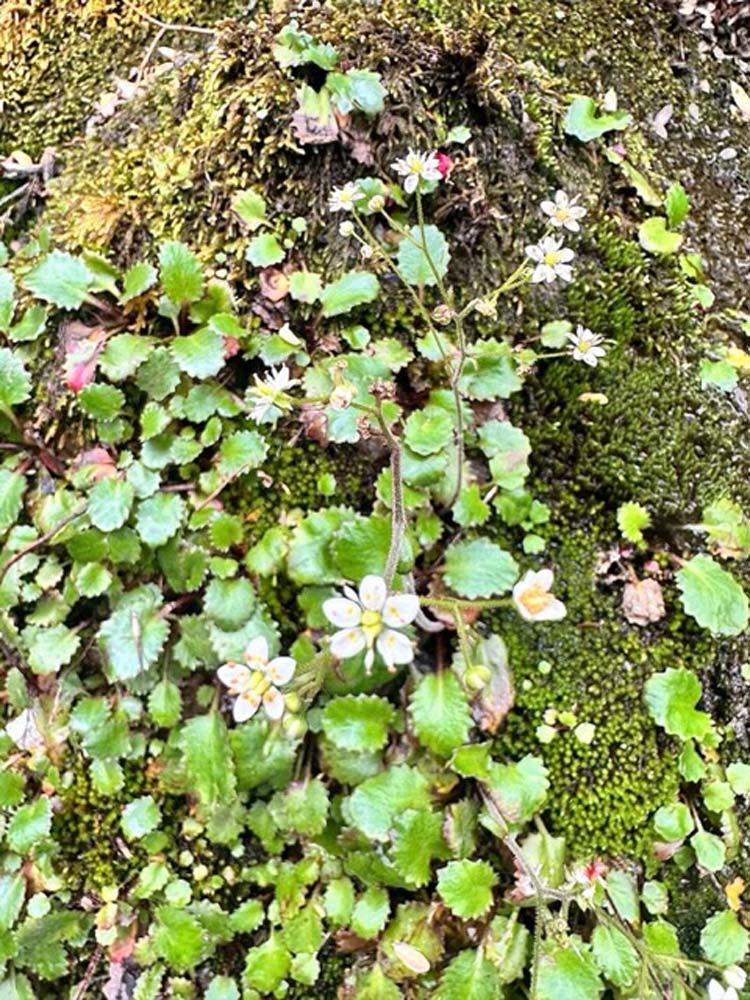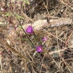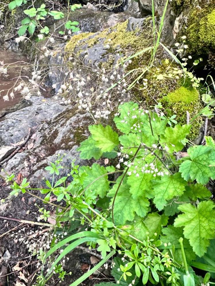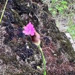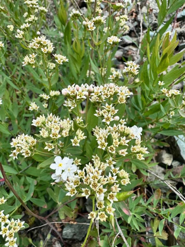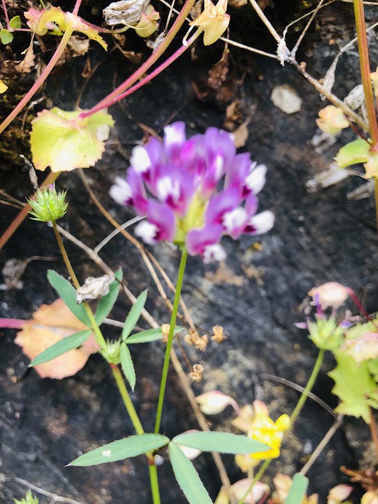 At the trail’s beginning, Eva was excited to see the Red or Canyon larkspur (Delpihinium nudicale) which she had not seen before. Just for starters, we encountered Common comandra (Comandra umbellata), Common whipplea (Whipplea modesta), Hairy pinks (Petrorhagi dubia), Marshall’s saxifrage (Saxifrage marshallii), and Silverback luina (Lunia hypoleuca), Cutleaf silverpuffs — on both its yellow dandelion-like flowers and its silver puff seedheads– (Microseris lacinata.